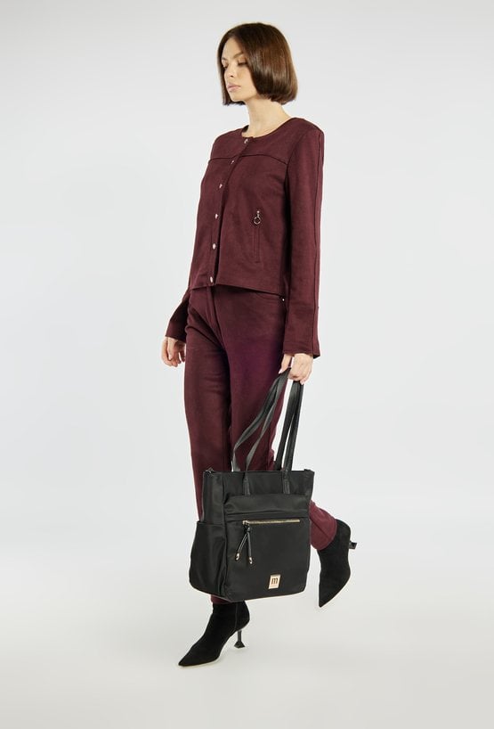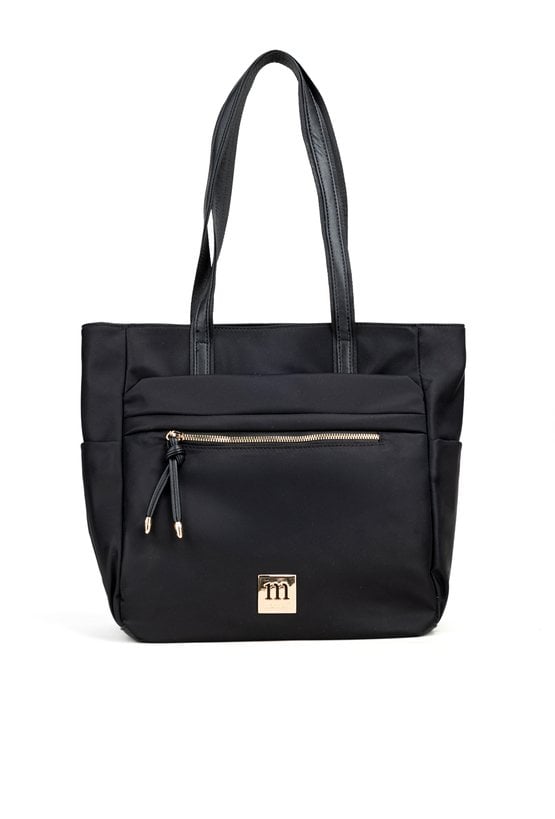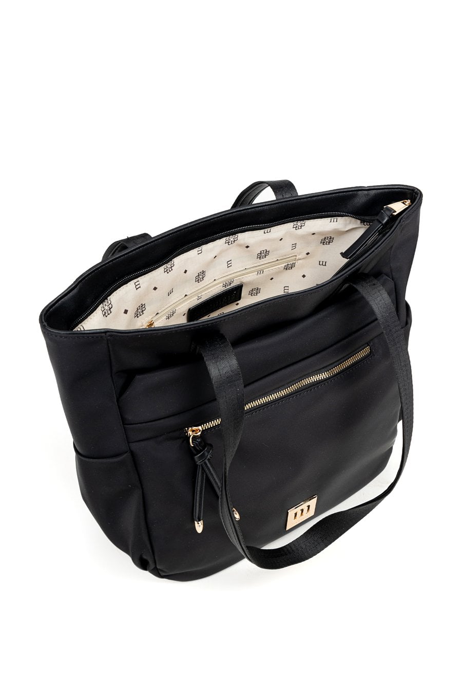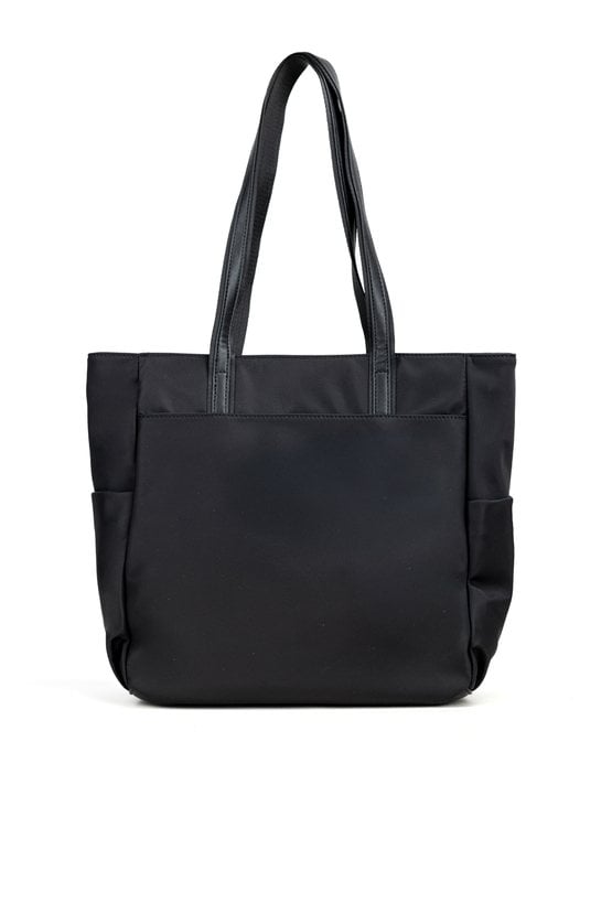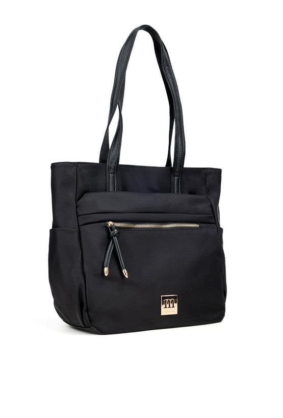 Duża torba damska o wymiarach 37 cm x 33 cm x 14 cm. Model jednokomorowy, z jasną, logowaną podszewką, zawieszony na rączkach. Z przodu znajdują się dwie praktyczne kieszonki, a po bokach dodatkowe kieszenie idealne na napój lub drobiazgi, co czyni torbę wyjątkowo funkcjonalną na co dzień. Torebkę należy przechowywać w dołączonym woreczku.