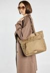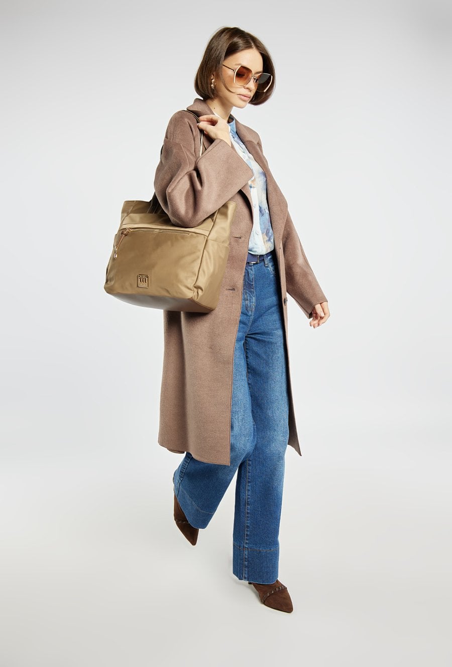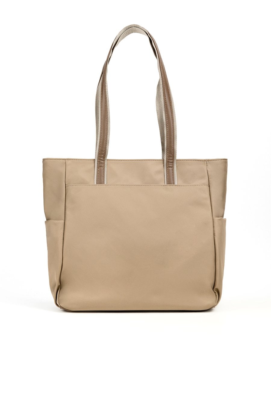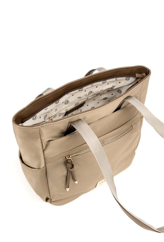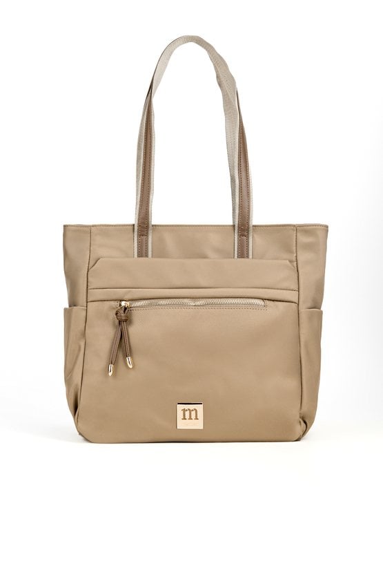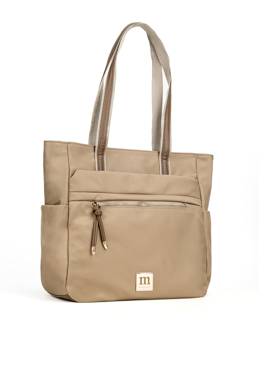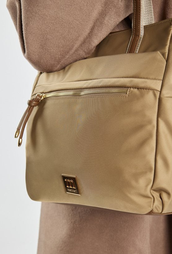 Duża torba damska o wymiarach 37 cm x 33 cm x 14 cm. Model jednokomorowy, z jasną, logowaną podszewką, zawieszony na rączkach. Z przodu znajdują się dwie praktyczne kieszonki, a po bokach dodatkowe kieszenie idealne na napój lub drobiazgi, co czyni torbę wyjątkowo funkcjonalną na co dzień. Torebkę należy przechowywać w dołączonym woreczku.