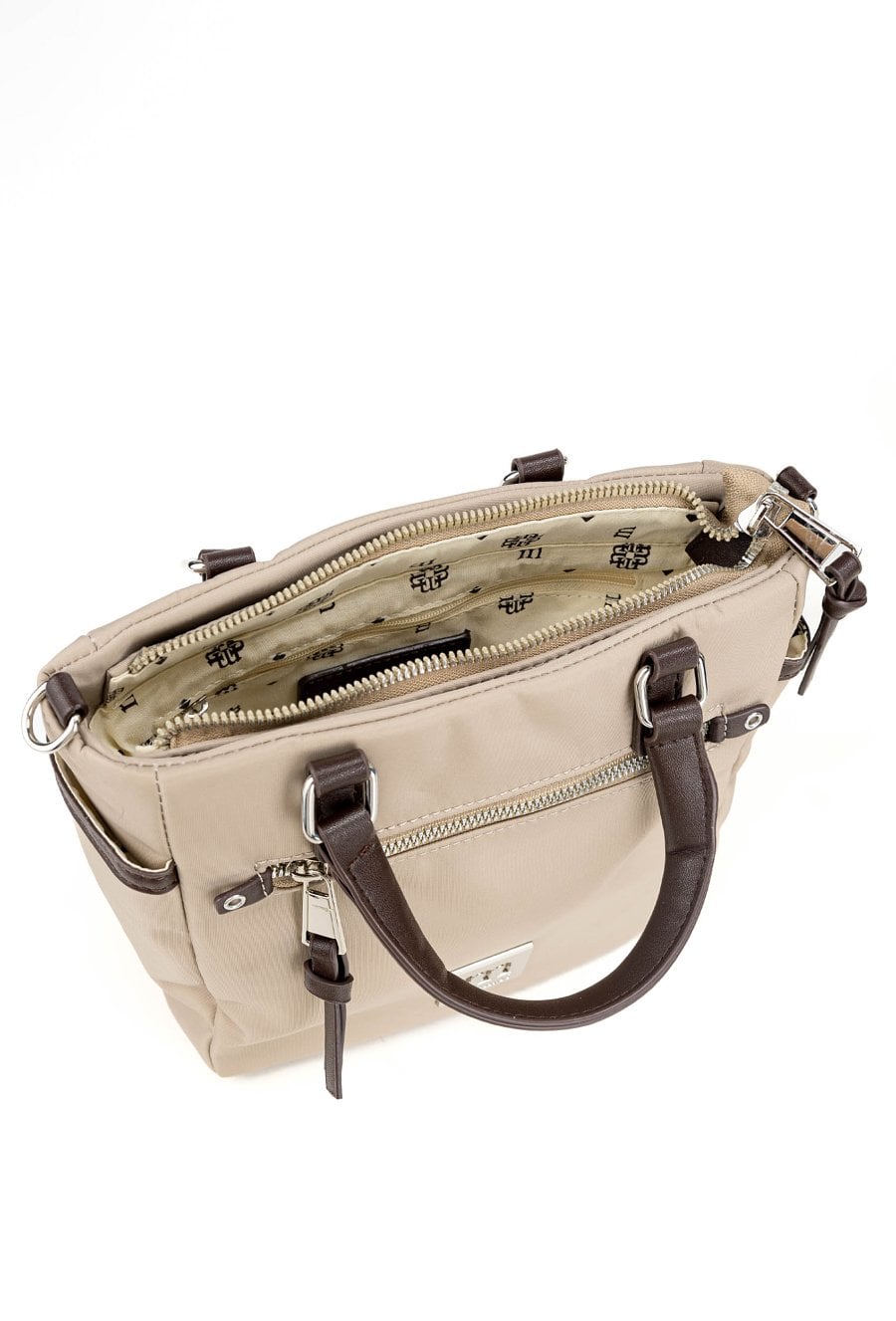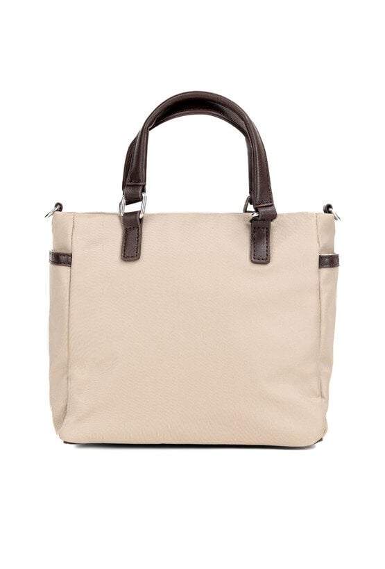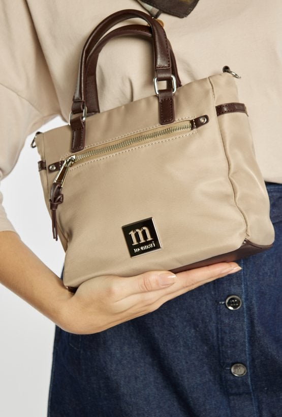 Mała torebka z rączkami. Model jednokomorowy, z jasną, logowaną podszewką oraz dodatkowymi kieszonkami na drobiazgi. Torbę należy przechowywać w dołączonym woreczku. Wymiary: 24 cm x 20 cm x 8,5 cm.