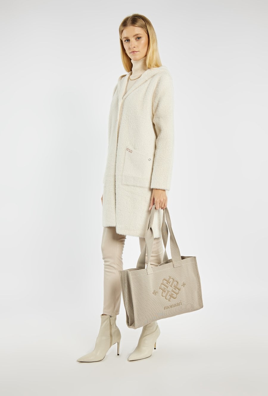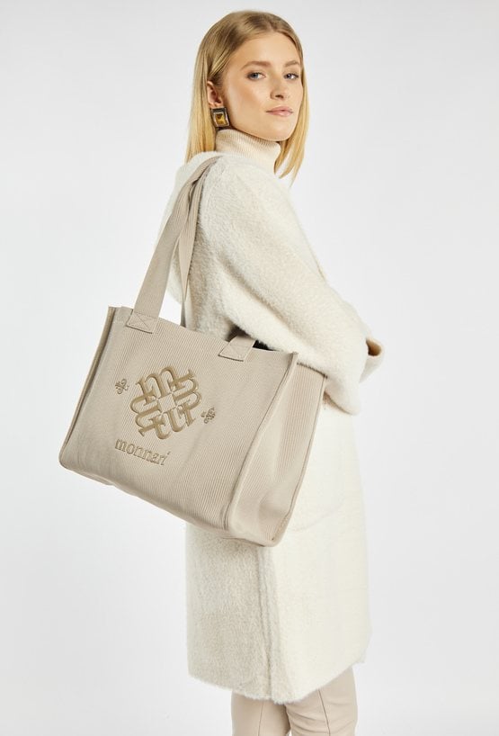 Torba damska typu shopper wykonana ze strukturalnego materiału. Model jednokomorowy, bez dodatkowych kieszonek, wygodnie zawieszony na stylowych rączkach. Z przodu torby umieszczono ozdobne logo marki Monnari, które dodaje jej elegancji i podkreśla markowy charakter. Wymiary: 39,5 cm x 28 cm x 13,5 cm
