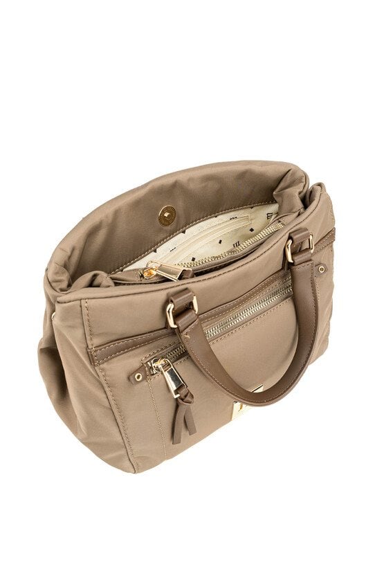 Tekstylna torba damska o wymiarach: 26 cm x 22 cm x 13 cm. Model trzykomorowy – dwie komory zapinane na napy, a środkowa na suwak, co zapewnia wygodny dostęp i bezpieczeństwo przechowywanych rzeczy. Torba zawieszona na rączkach, a w zestawie ma regulowany pasek. Należy przechowywać w dołączonym woreczku