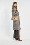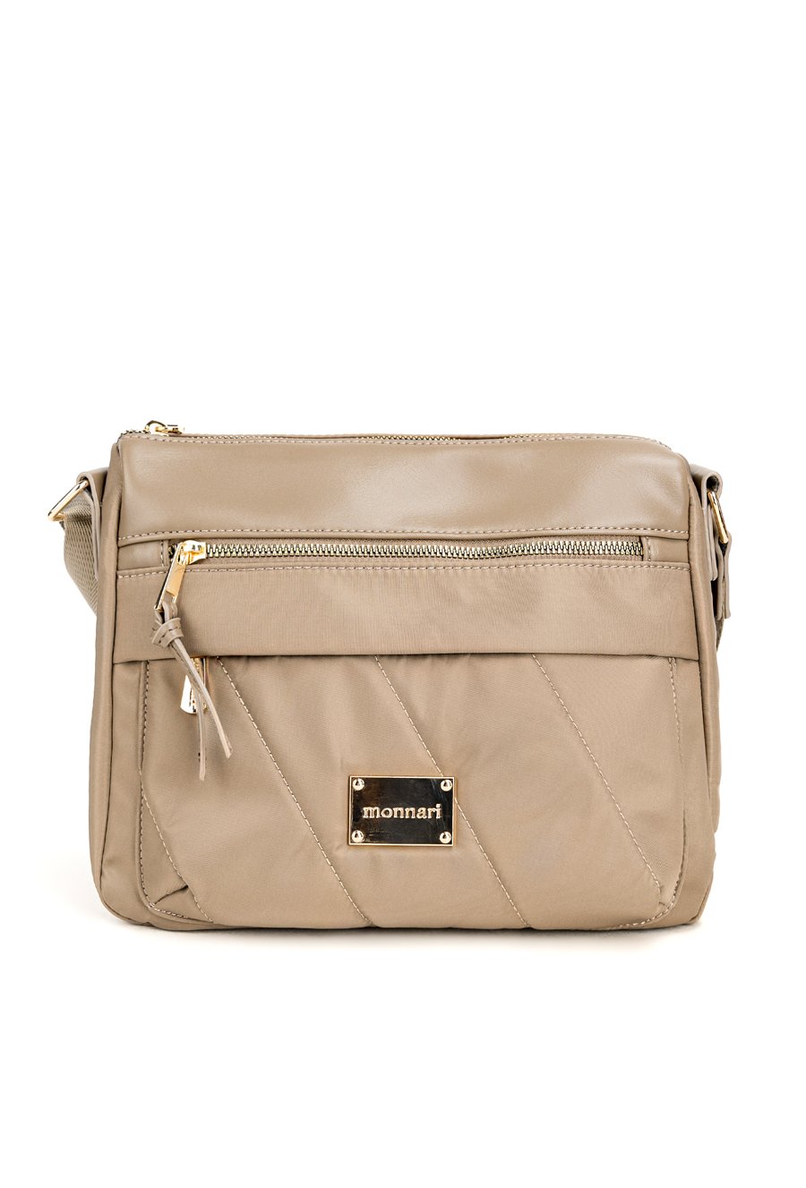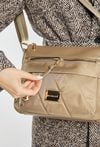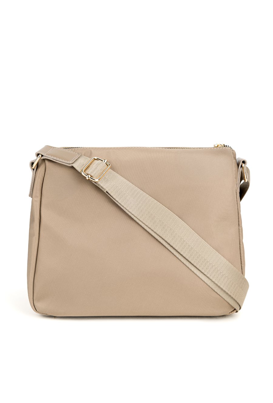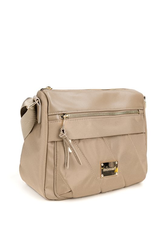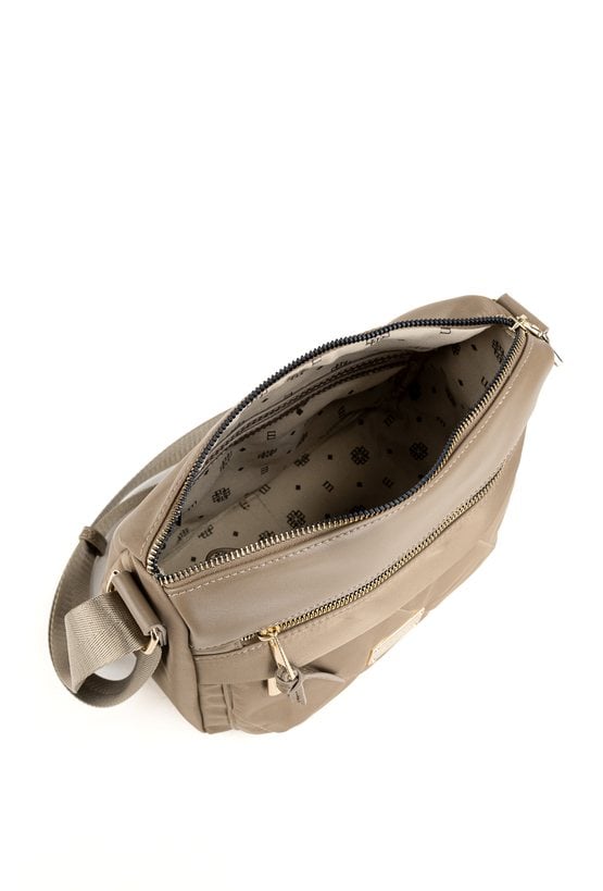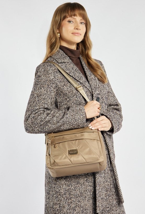 Stylowa tekstylna torba damska, zawieszona na praktycznym, regulowanym pasku. Jednokomorowe wnętrze zostało wykończone jasną, logowaną podszewką i wzbogacone o dodatkowe kieszonki zarówno wewnątrz, jak i na zewnątrz. Dzięki wymiarom 28,5 cm x 23 cm x 10 cm świetnie sprawdzi się jako codzienna towarzyszka miejskich stylizacji. Torbę należy przechowywać w dołączonym woreczku.