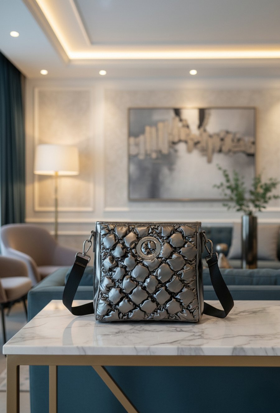 Torebka damska o przyciągającym uwagę pikowaniu, łącząca funkcjonalność z modnym designem. Model jednokomorowy z jasną, logowaną podszewką oraz dodatkowymi kieszonkami ułatwiającymi organizację drobiazgów. Zapinana od góry na suwak i zawieszona na regulowanym pasku, który zapewnia wygodę noszenia. Torbę należy przechowywać w dołączonym woreczku. Wymiary: 26 cm x 24 cm x 9 cm.