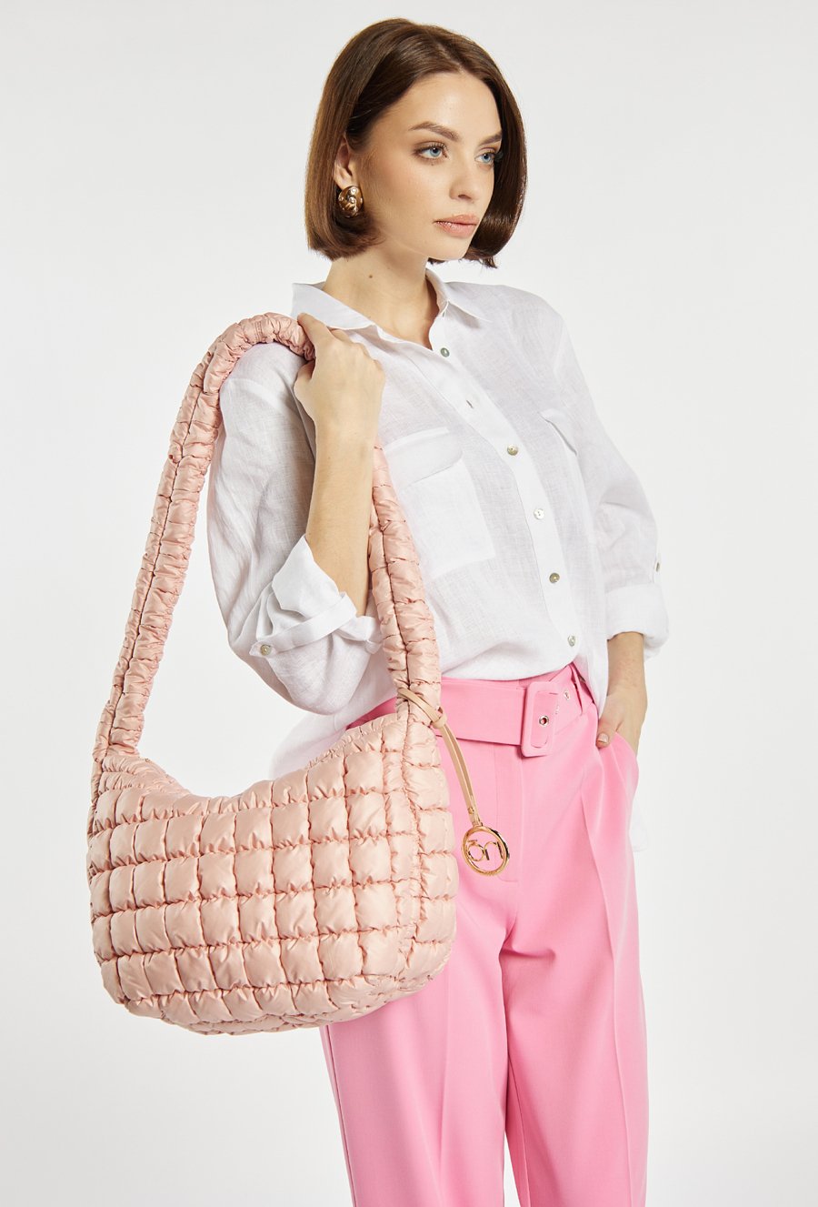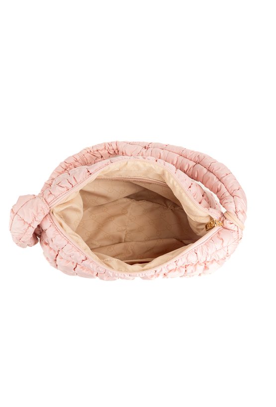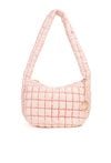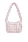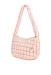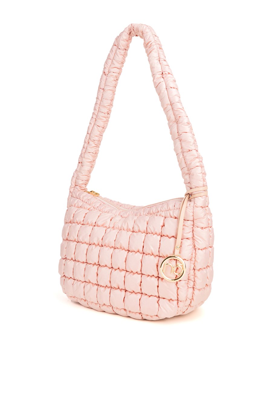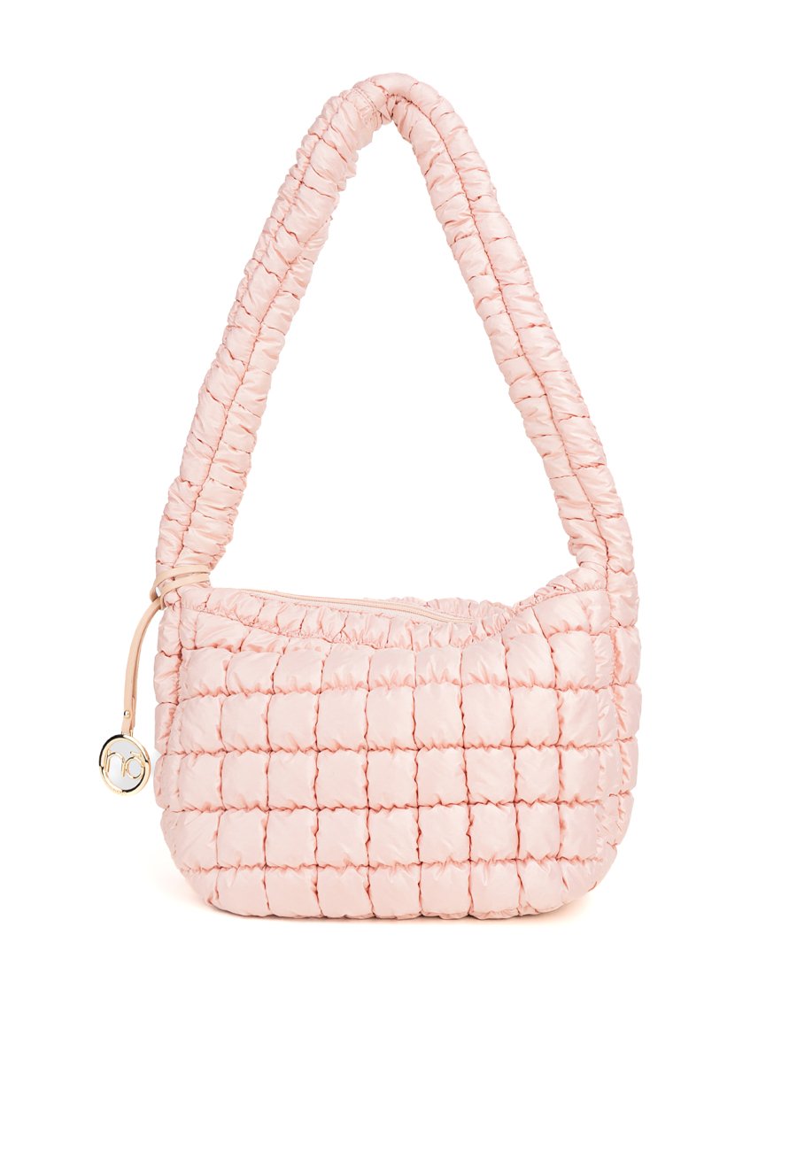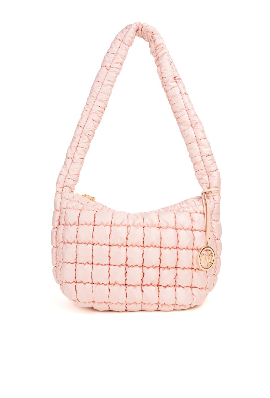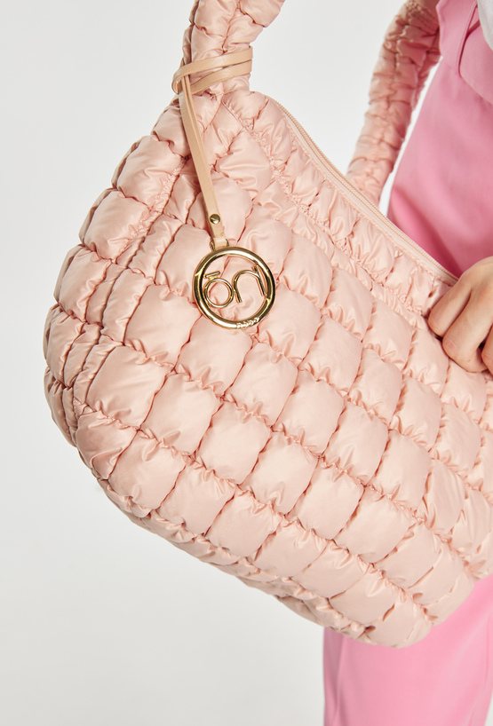 Damska torba z ciekawą, pikowaną fakturą. Jednokomorowe wnętrze z jasną, logowaną podszewką wyposażono w dodatkowe kieszonki na drobiazgi. Torba zawieszona na długiej rączce, przy której umieszczono ozdobną zawieszkę z logo marki NOBO. Torbę należy przechowywać w dołączonym woreczku. Wymiary: 39 cm x 24 cm x 15 cm.