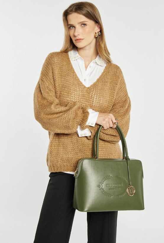 Pojemna torba damska o wymiarach: 37,5 cm x 25 cm x 10,5 cm. Torba jednokomorowa o jasnej logowanej podszewce z dodatkowymi kieszonkami na drobiazgi. Torba zawieszona na wygodnych rączkach, a w zestawie znajduje się regulowany pasek. Całość zdobi efektowna zawieszka z logo marki Monnari oraz subtelnie wyryte logo z przodu, dodające całości nowoczesnego charakteru.