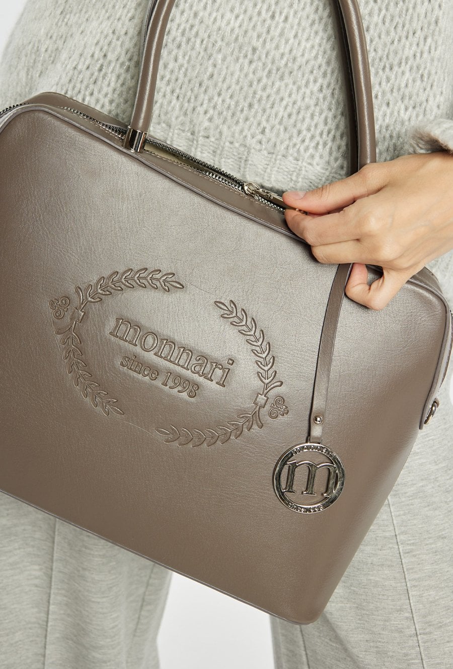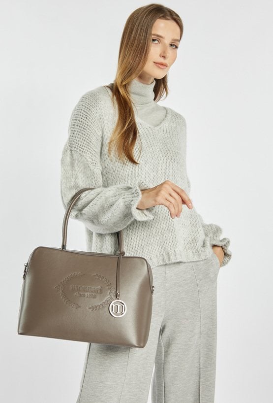 Pojemna torba damska o wymiarach: 37,5 cm x 25 cm x 10,5 cm. Torba jednokomorowa o jasnej logowanej podszewce z dodatkowymi kieszonkami na drobiazgi. Torba zawieszona na wygodnych rączkach, a w zestawie znajduje się regulowany pasek. Całość zdobi efektowna zawieszka z logo marki Monnari oraz subtelnie wyryte logo z przodu, dodające całości nowoczesnego charakteru.
