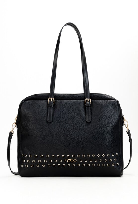 Torba do pracy nie musi być wyłącznie praktyczna. Czarna aktówka NOBO z nitami jest tego idealnym przykładem – jako model nie tylko praktyczny, ale również stylowy. Została wykonana z wysokiej jakości, miękkiej skóry ekologicznej. Nity w kolorze jasnego złota nadają jej rockowego charakteru, dzięki czemu torebka będzie świetnie się prezentować nie tylko z eleganckimi stylizacjami, ale również z ciężkimi butami i ramoneską. Posiada jedną przestronną komorę, w której zmieścisz dokumenty formatu A4 oraz laptopa max 16”. Torba nie posiada dedykowanej koszeni na komputer. Nie musisz także martwić się o komfort noszenia aktówki NOBO – poza wygodnymi rączkami z regulacją do zestawu dołączony jest długi pasek. Aktówka na laptopa to połączenie stylu, funkcjonalności oraz jakości, które docenisz każdego dnia.