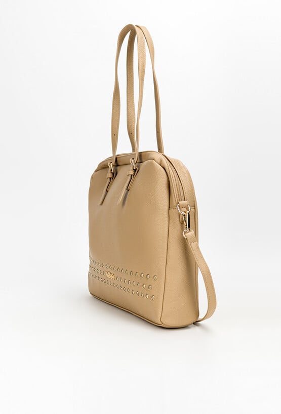 Torba do pracy nie musi być wyłącznie praktyczna. Beżowa aktówka NOBO z nitami jest tego idealnym przykładem – jako model nie tylko praktyczny, ale również stylowy. Została wykonana z wysokiej jakości, miękkiej skóry ekologicznej. Nity w kolorze jasnego złota nadają jej rockowego charakteru, dzięki czemu torebka będzie świetnie się prezentować nie tylko z eleganckimi stylizacjami, ale również z ciężkimi butami i ramoneską. Posiada jedną przestronną komorę, w której zmieścisz dokumenty formatu A4 oraz laptopa max 16”. Torba nie posiada dedykowanej koszeni na komputer. Nie musisz także martwić się o komfort noszenia aktówki NOBO – poza wygodnymi rączkami z regulacją do zestawu dołączony jest długi pasek. Aktówka na laptopa to połączenie stylu, funkcjonalności oraz jakości, które docenisz każdego dnia.