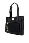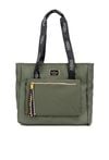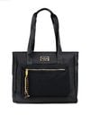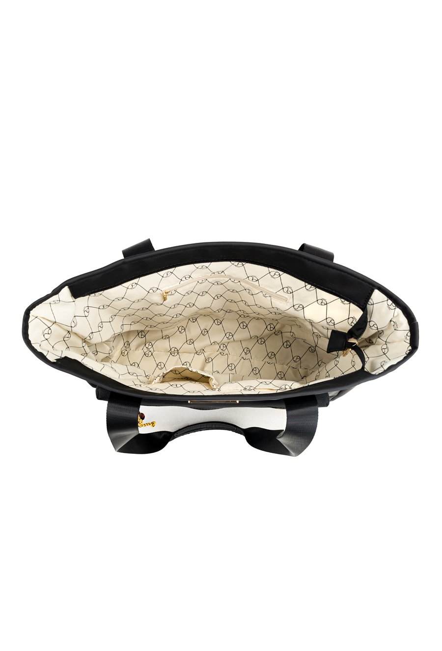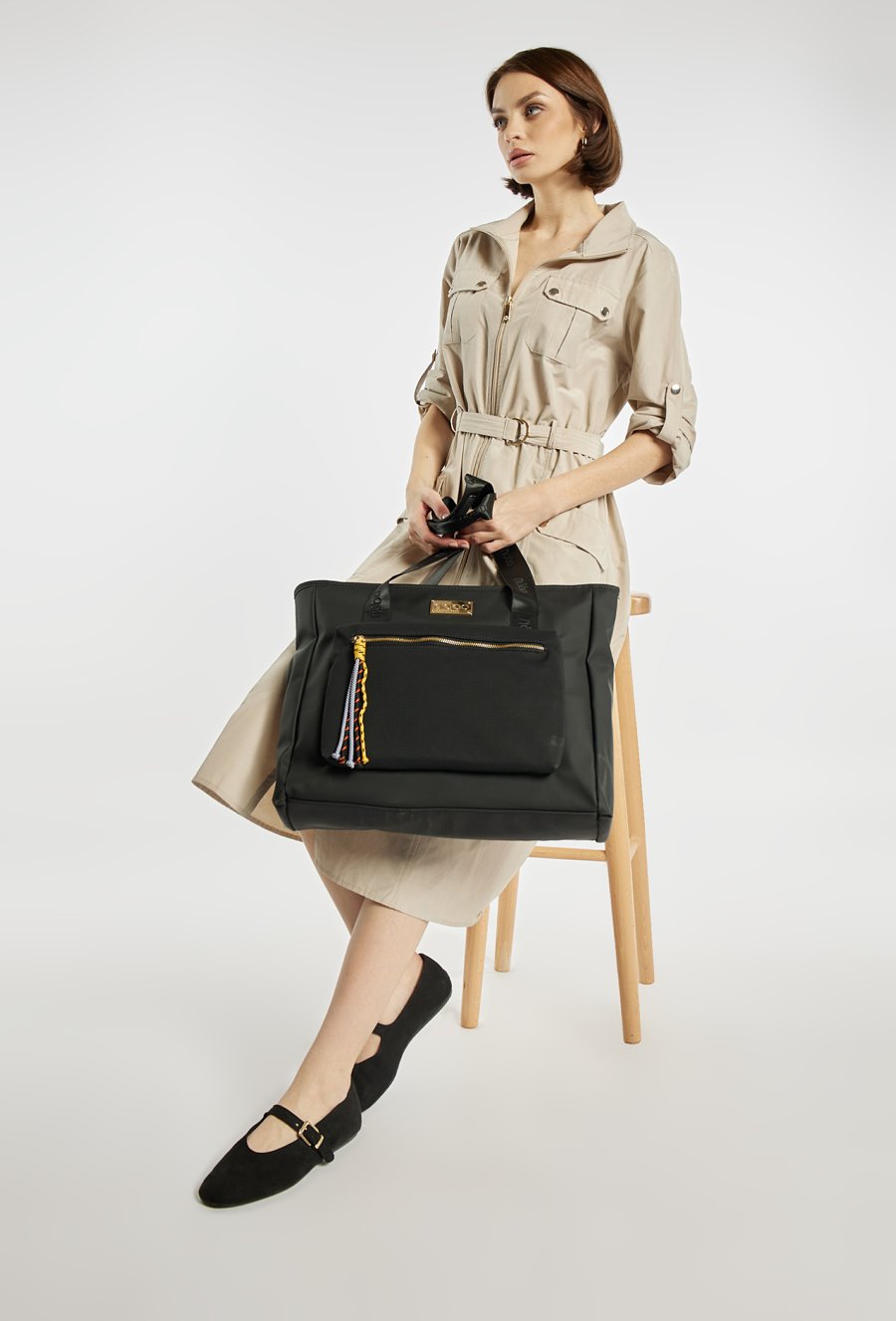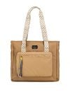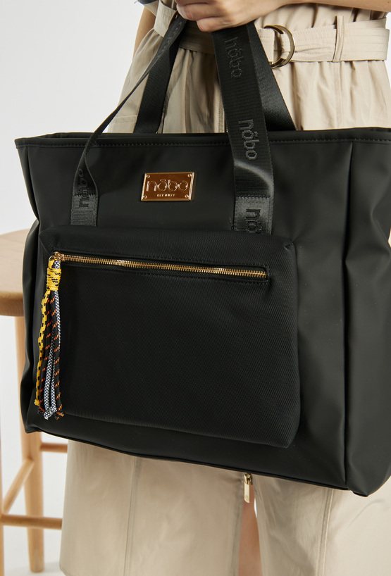 Duża torba damska typu shopper o wymiarach 46 × 35 × 12,5 cm. Torba jednokomorowa z jasną, logowaną podszewką oraz dodatkowymi kieszonkami na drobiazgi. Torba zawieszona na wzorzystych rączkach, które dodają jej charakteru. Z przodu znajduje się kieszonka zapinana na suwak, ozdobiona kolorowymi frędzlami. Idealna na co dzień.