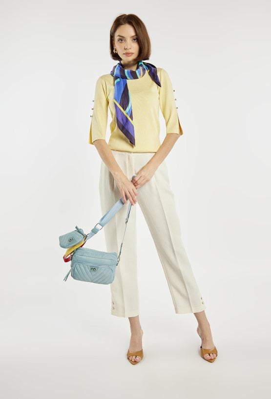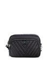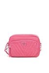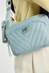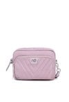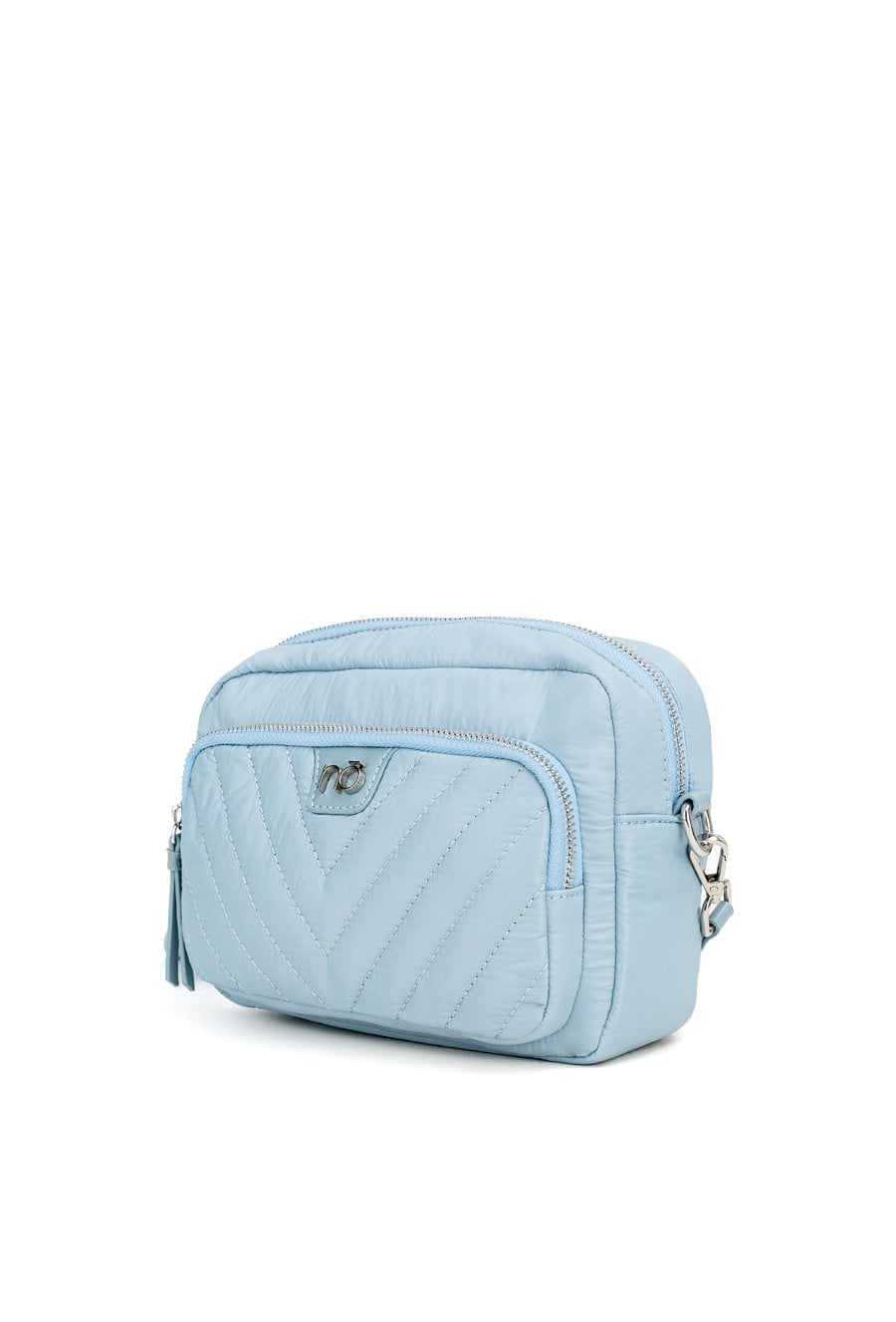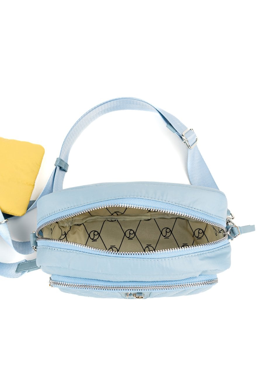Damska torba z dodatkowymi małymi saszetkami. Jednokomorowe wnętrze z jasną, logowaną podszewką oraz dodatkowymi kieszonkami ułatwia organizację drobiazgów. Z przodu znajduje się pikowana kieszonka, a całość zawieszona jest na regulowanym, odpinanym pasku. Torbę należy przechowywać w dołączonym woreczku. Wymiary: 22,5 cm x 15,5 cm x 8 cm.