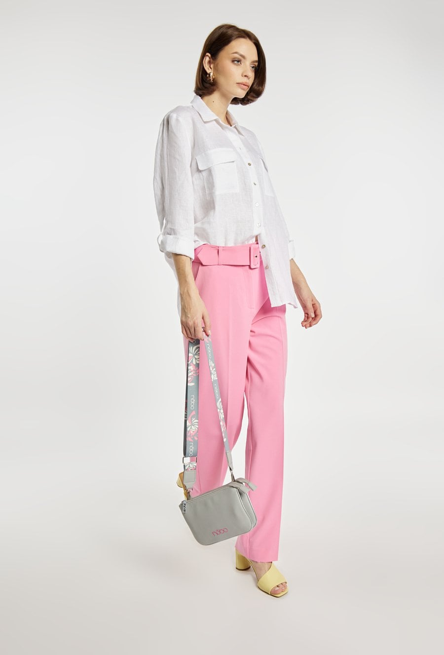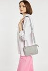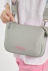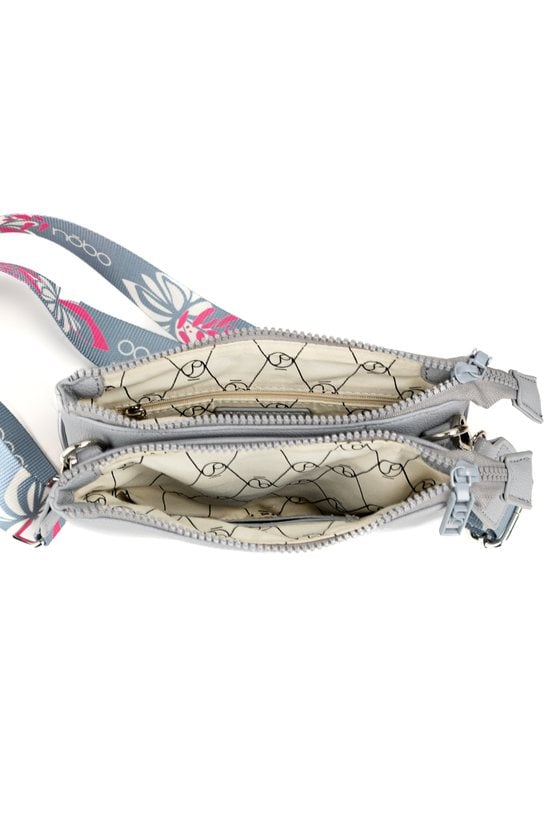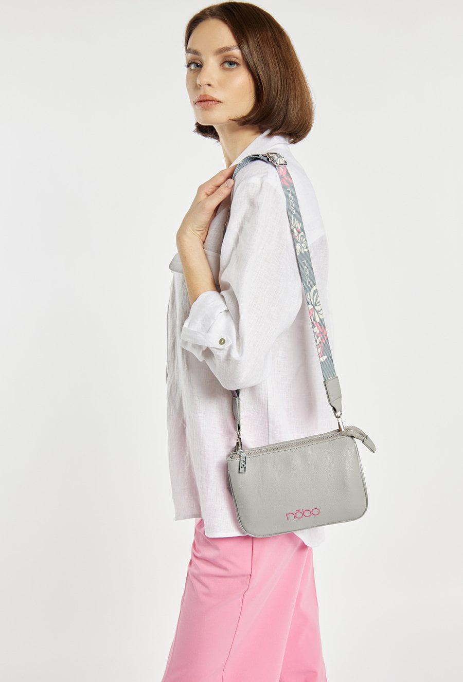 Dwukomorowa torba typu crossbody z haftowanym, małym logo marki NOBO. Wnętrze wykończone jasną, logowaną podszewką z dodatkowymi kieszonkami na drobiazgi. Torba zawieszona na wzorzystym, regulowanym pasku. Torbę należy przechowywać w dołączonym woreczku. Wymiary: 22 cm x 14,5 cm x 3 cm.