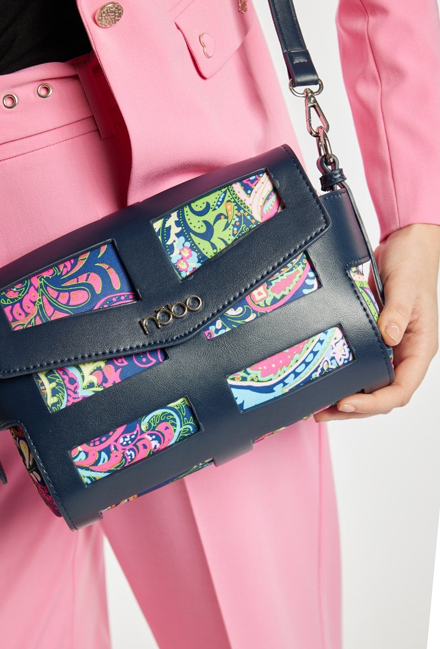 Torebka damska typu crossbody z ozdobnymi pasami tworzącymi wyrazisty, modowy akcent. Torba jednokomorowa z jasną, logowaną podszewką i dodatkowymi kieszonkami na drobiazgi. Torba zawieszona na regulowanym pasku, wygodna do noszenia na co dzień. Torbę należy przechowywać w dołączonym woreczku. Wymiary: 24 × 19 × 10 cm