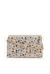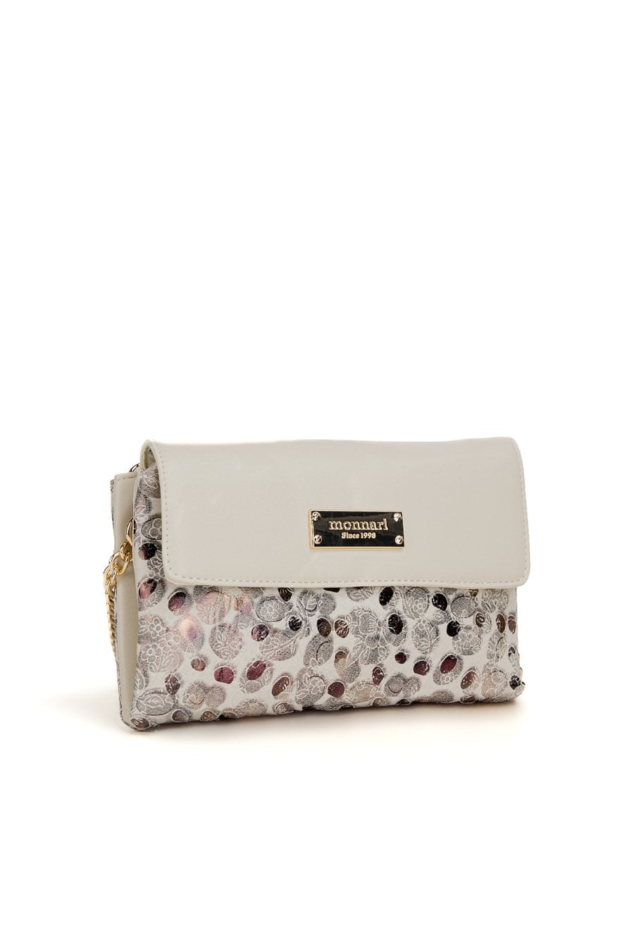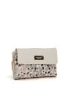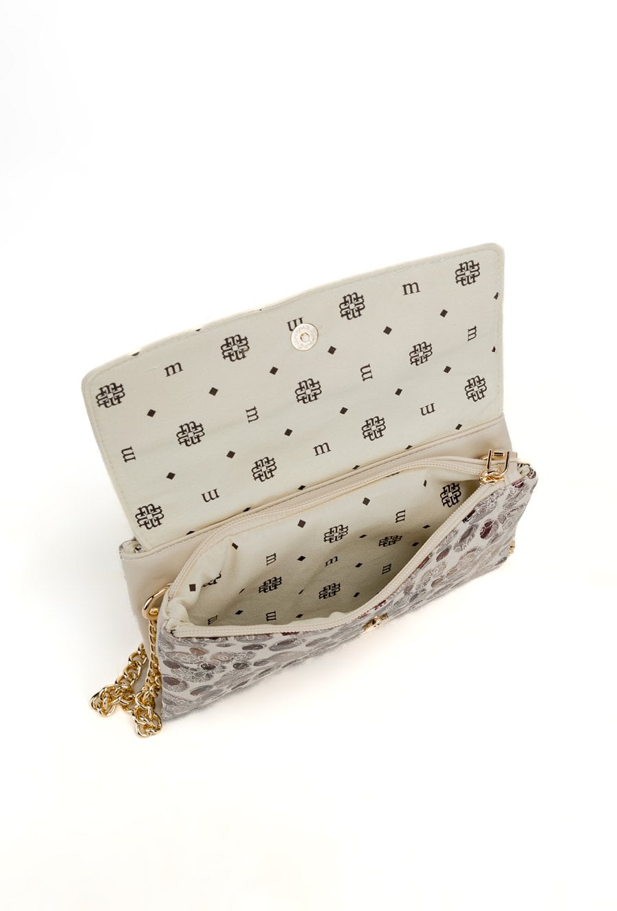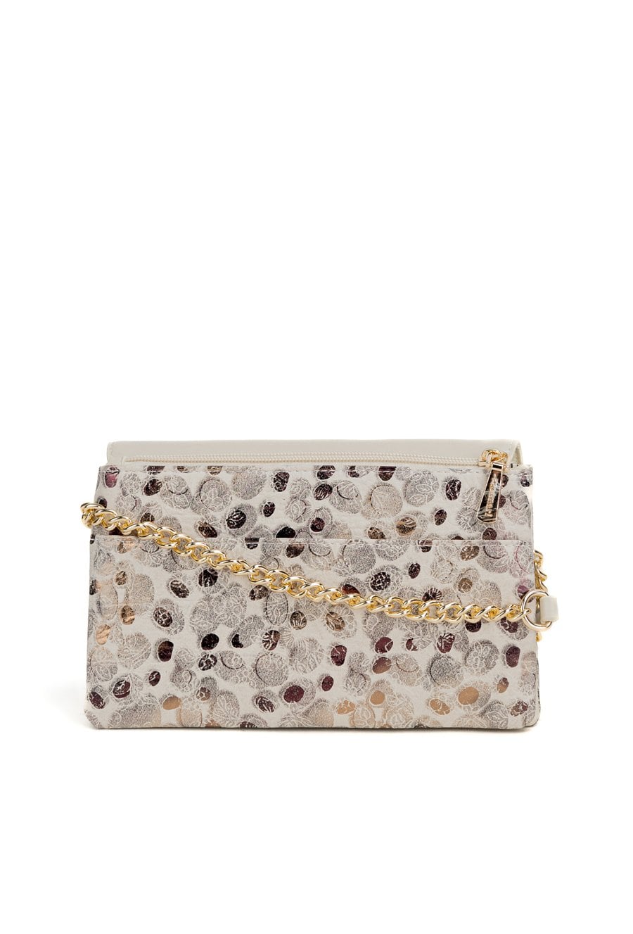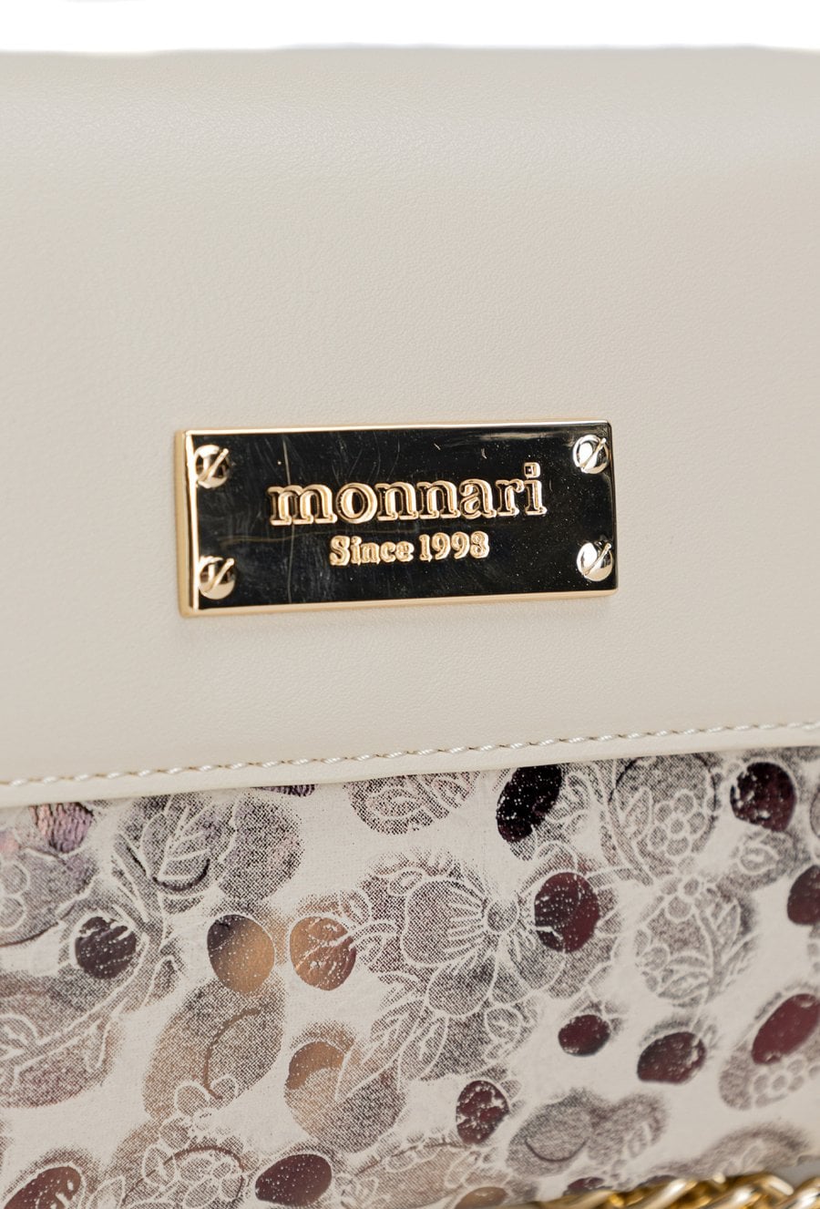 Mała torebka damska z wzorem o wymiarach 22 × 14 × 2 cm to idealny model na telefon i najpotrzebniejsze drobiazgi. Torba ma klapę oraz jasne, logowane wnętrze, a z tyłu znajduje się praktyczna kieszonka zapinana na suwak. Torba zawieszona na regulowanym pasku z łańcuszkiem. Torbę należy przechowywać w dołączonym woreczku.