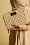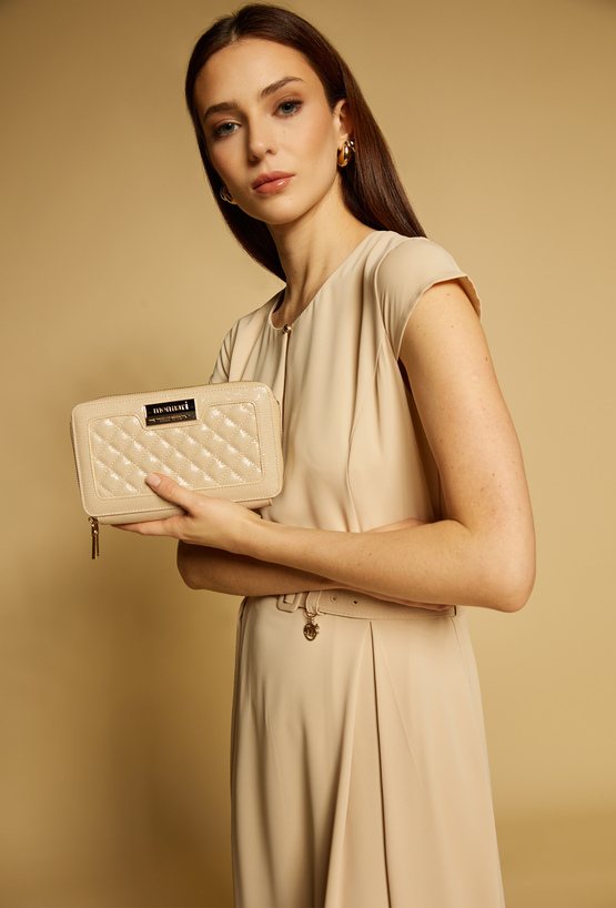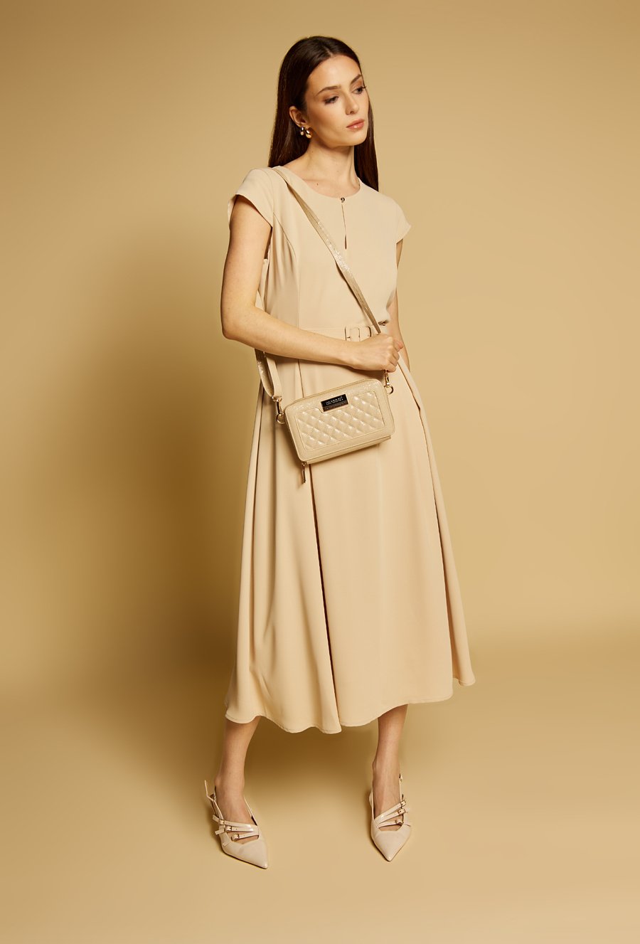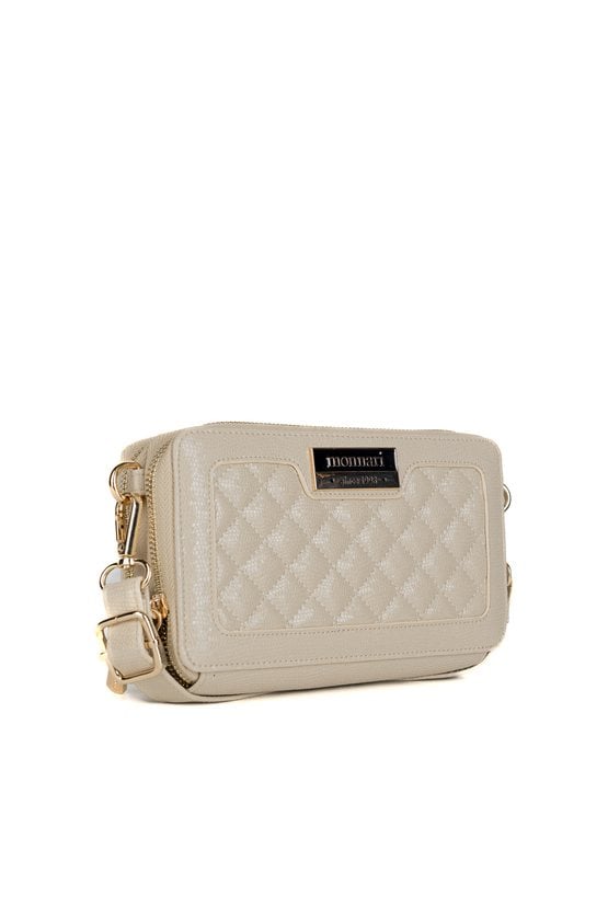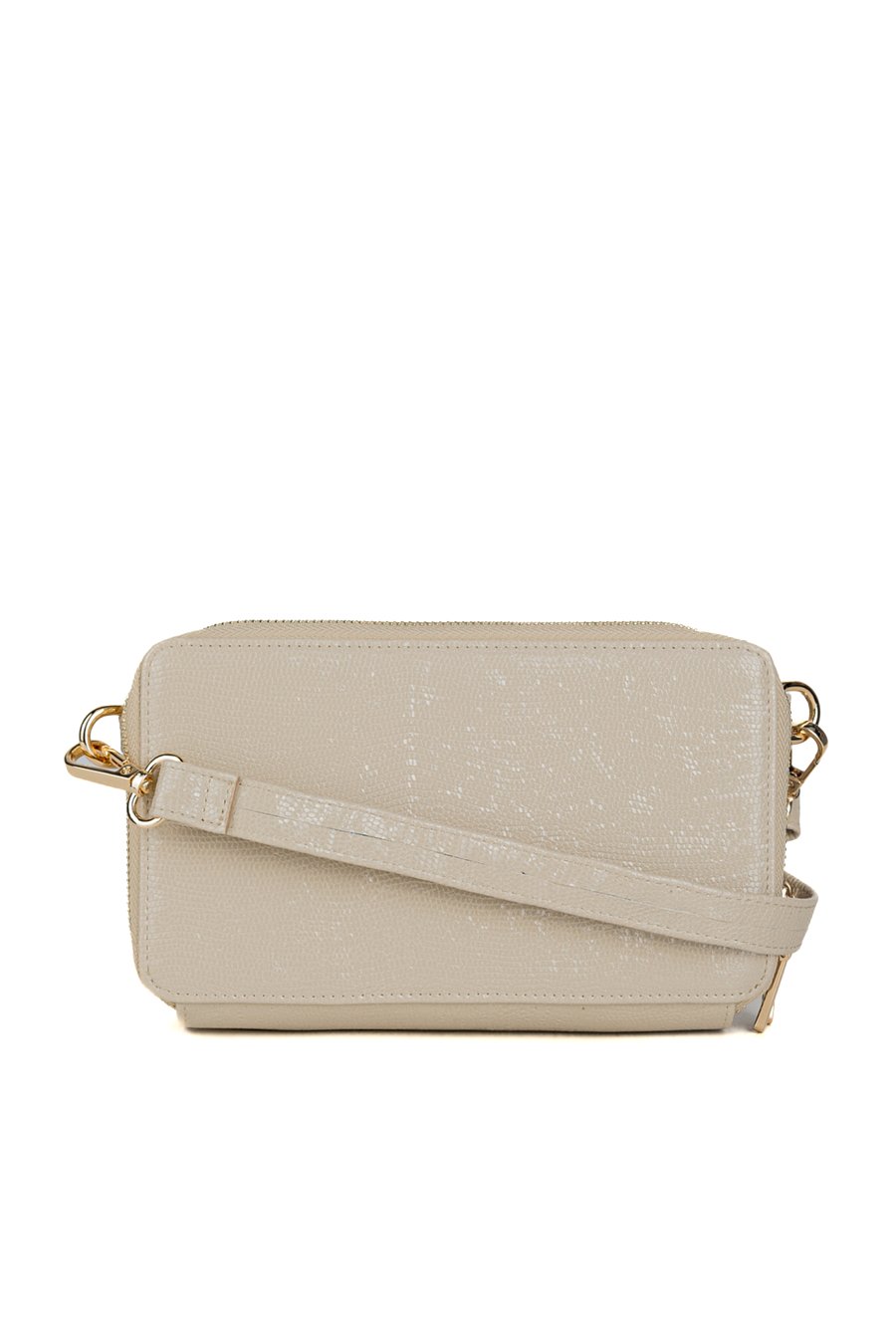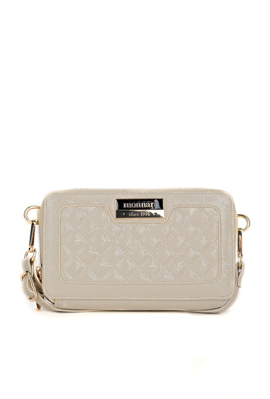 Mała torebka damska o wymiarach 22 cm x 12 cm x 5,5 cm, dwukomorowa i zapinana na suwaki. Wewnątrz znajdują się przegrody na banknoty, które ułatwiają organizację. Torebka zawieszona na regulowanym pasku z możliwością odpięcia, dzięki czemu można nosić ją zarówno na ramieniu, jak i w dłoni. Torbę należy przechowywać w załączonym woreczku.