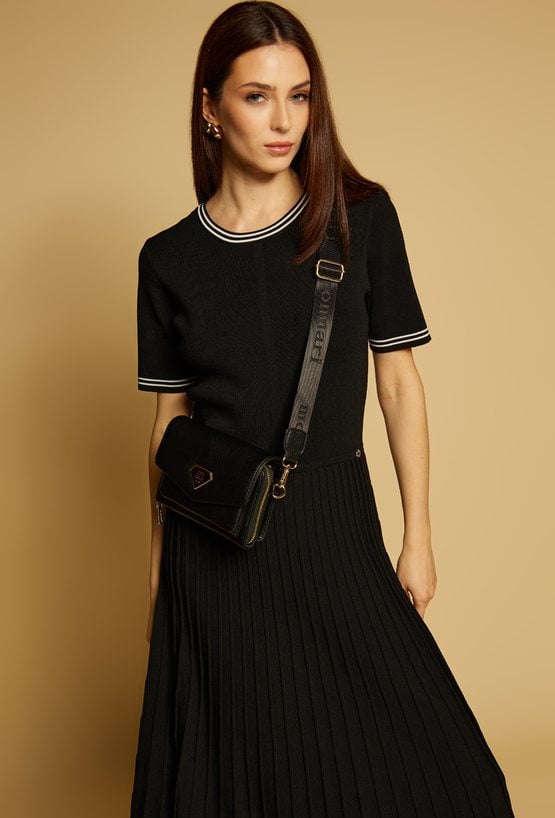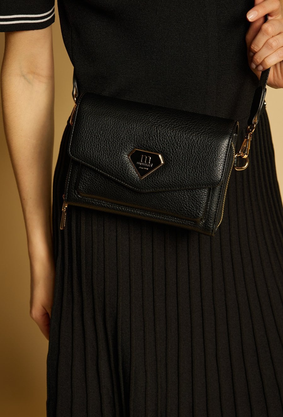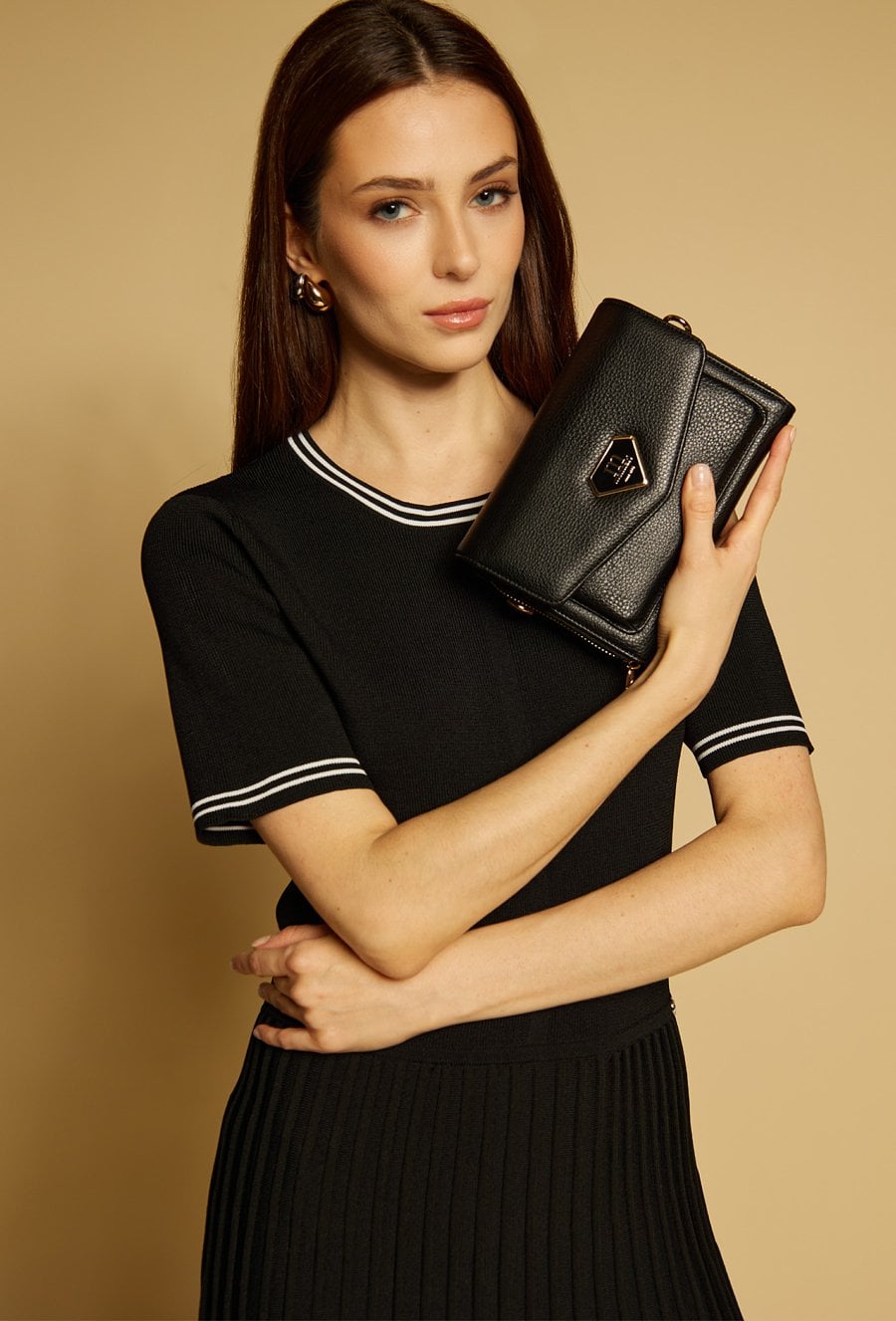 Mała torebka damska o wymiarach 19 cm x 15 cm x 5,5 cm, idealna na telefon. Torba dwukomorowa – jedna zamykana na suwak, druga bez zapięcia, co zapewnia wygodny dostęp do zawartości. Torba z klapą, zawieszona na regulowanym pasku z możliwością odpięcia, dzięki czemu można ją nosić zarówno na ramieniu, jak i w dłoni. Torbę należy przechowywać w załączonym woreczku.