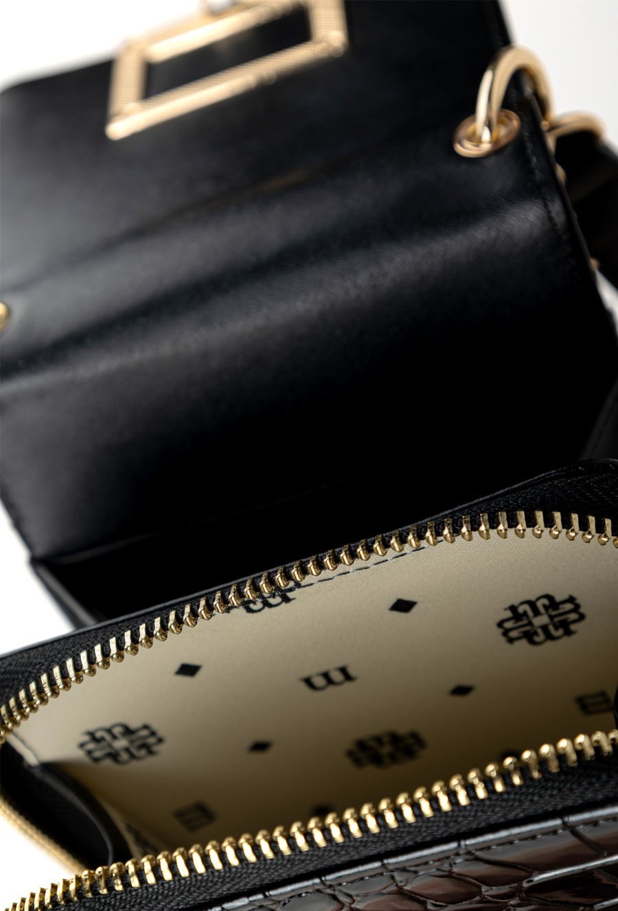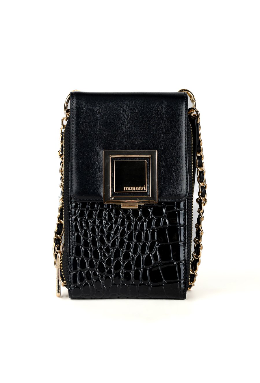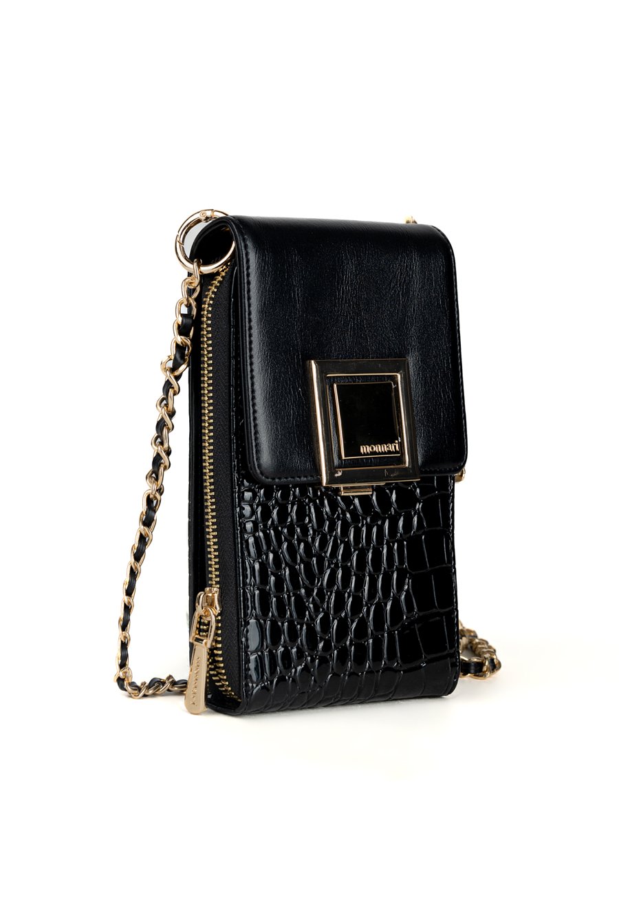 Stylowa i kompaktowa torebka damska, idealna na telefon i najpotrzebniejsze drobiazgi. Dwukomorowa konstrukcja zapinana na praktyczną klapkę pozwala na wygodną organizację, a jedna z komór została wyposażona w dedykowane miejsce na karty. Torebka zawieszona jest na krótkiej rączce oraz dekoracyjnym pasku z łańcuszkiem Torbę należy przechowywać w dołączonym woreczku. Wymiary: 12 cm x 18,5 cm x 3 cm.
