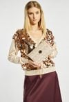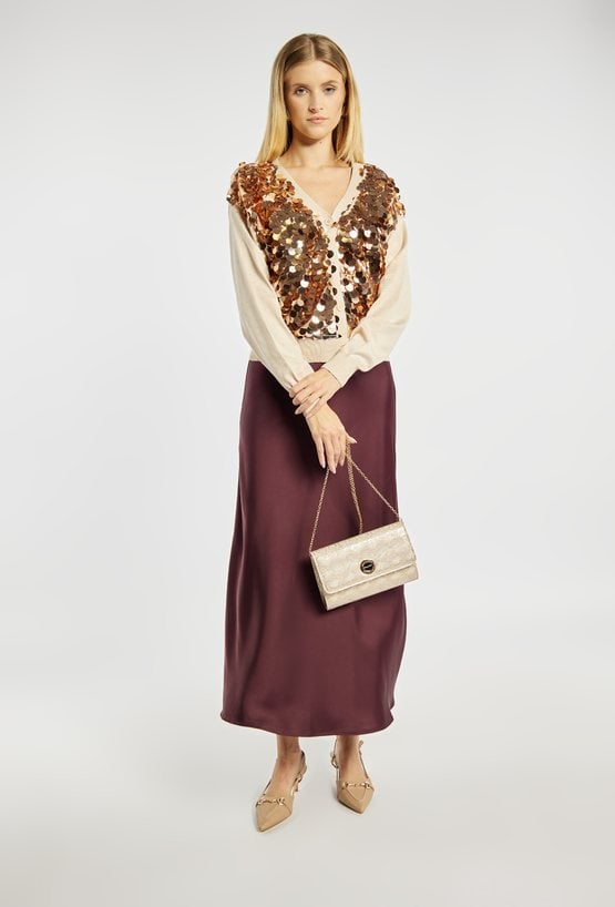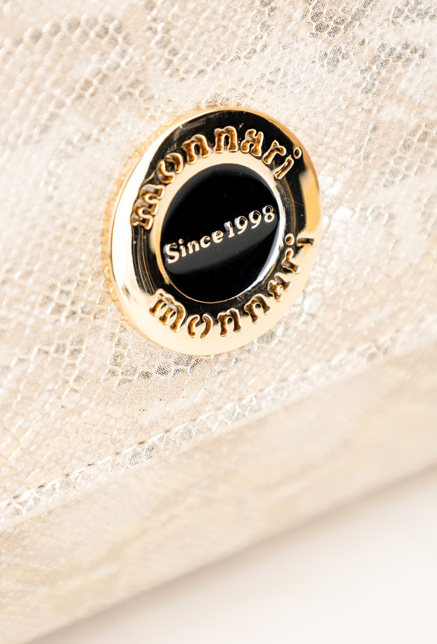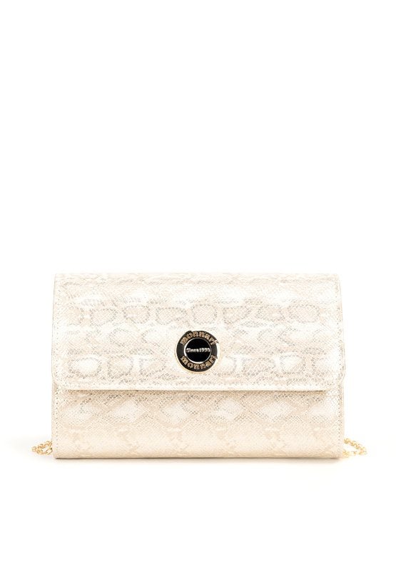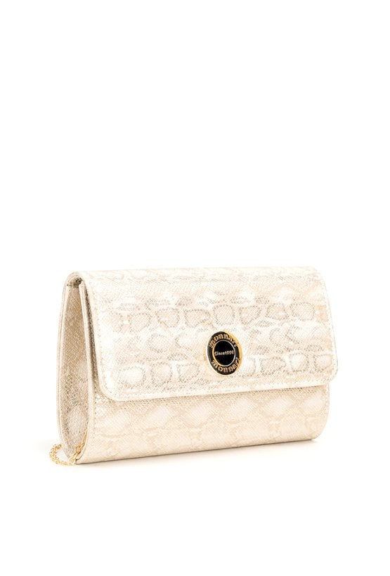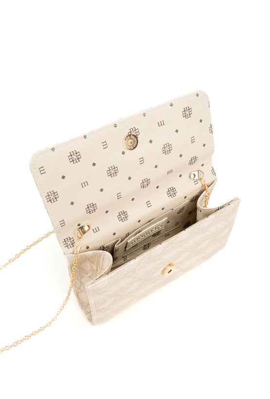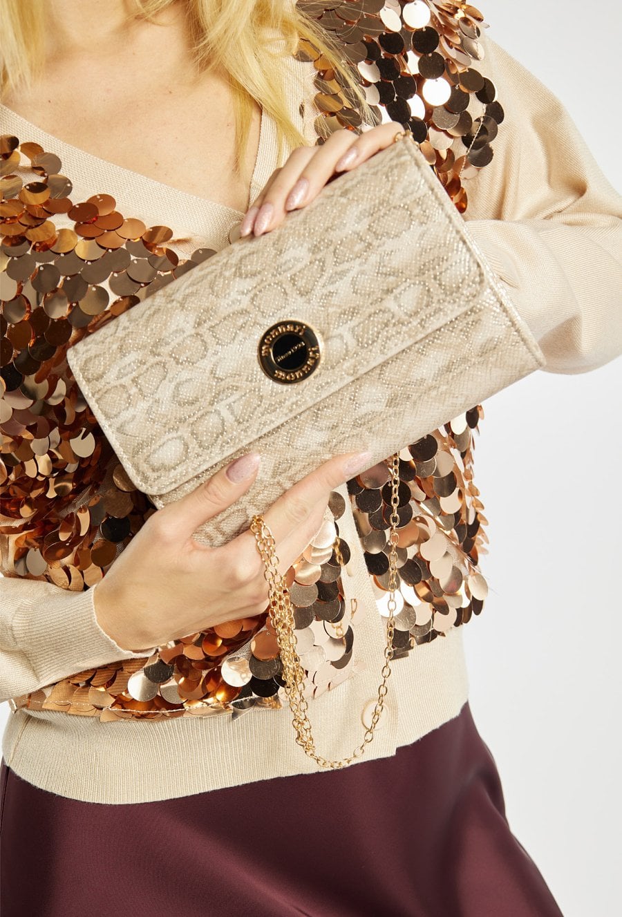 Torebka damska o wymiarach 22 cm x 16 cm x 6 cm, z klapą. Model jednokomorowy, z jasną, logowaną podszewką i dodatkową małą kieszonką wewnątrz. Torebka do ręki, z możliwością noszenia na ramieniu dzięki łańcuszkowemu paskowi dołączonemu do zestawu. Torebkę należy przechowywać w dołączonym woreczku.