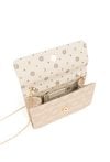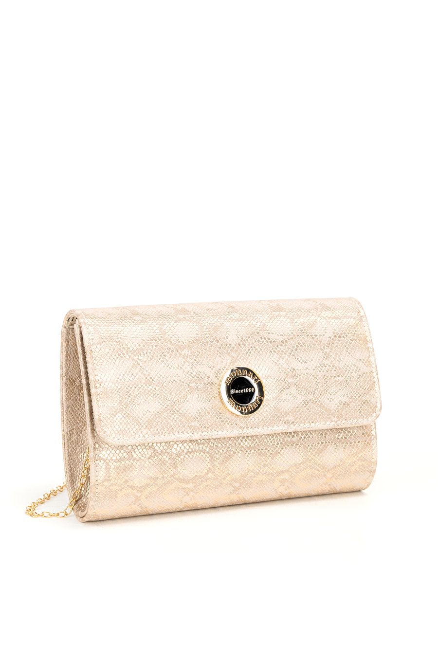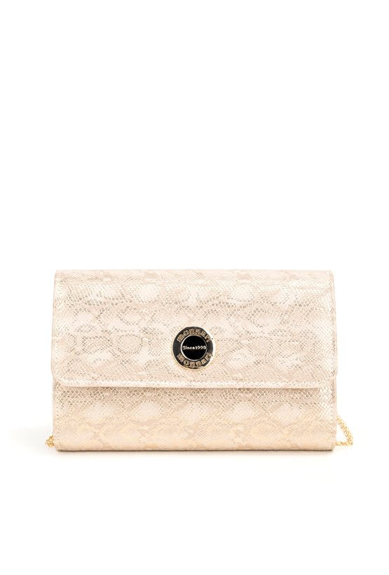 Torebka damska o wymiarach 22 cm x 16 cm x 6 cm, z klapą. Model jednokomorowy, z jasną, logowaną podszewką i dodatkową małą kieszonką wewnątrz. Torebka do ręki, z możliwością noszenia na ramieniu dzięki łańcuszkowemu paskowi dołączonemu do zestawu. Torebkę należy przechowywać w dołączonym woreczku.
