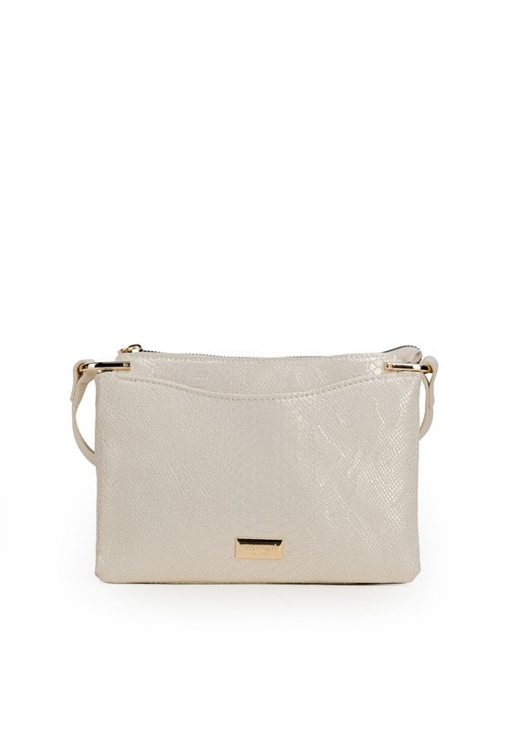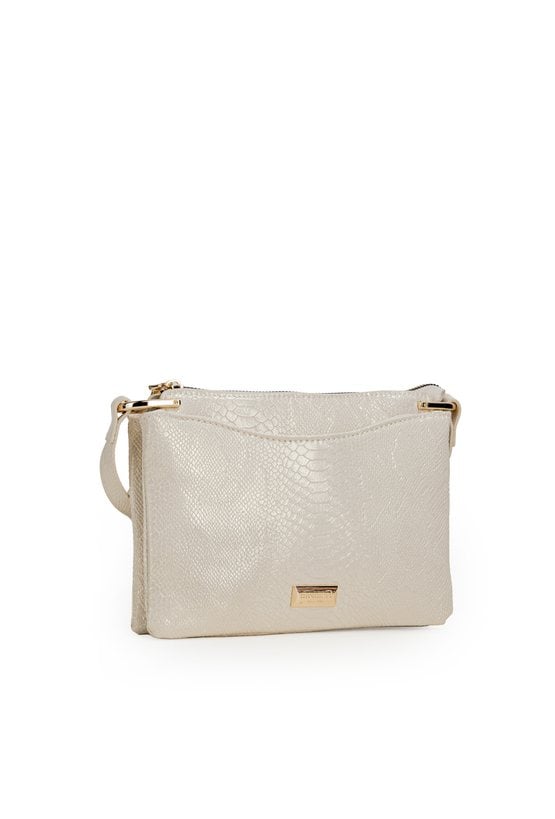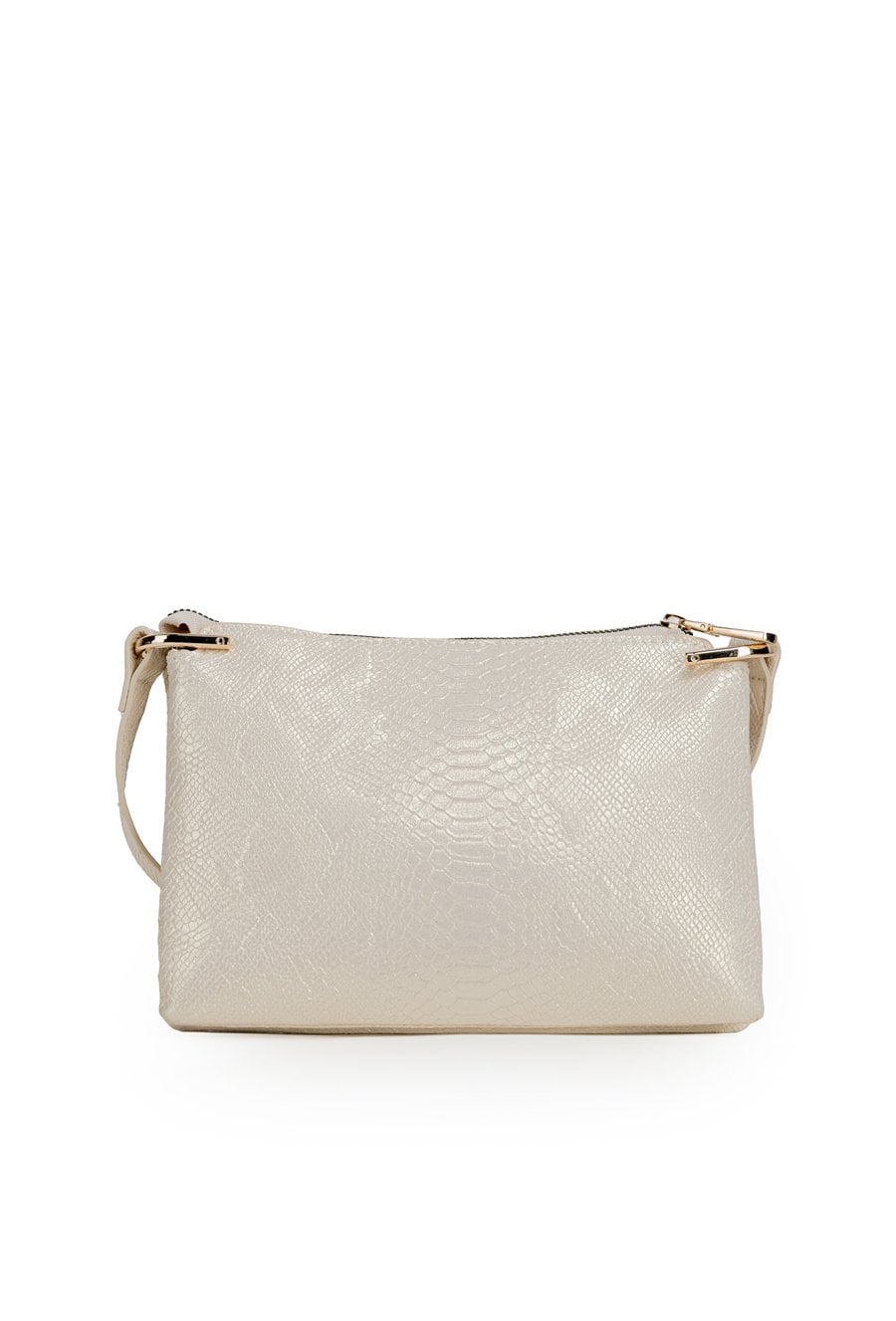 Elegancka torebka damska o wymiarach 22 × 16 × 3,5 cm. Jednokomorowy model z przedziałem pośrodku oraz dodatkowymi kieszonkami na drobiazgi. Torebka zawieszona na regulowanym pasku. Torbę należy przechowywać w dołączonym woreczku.