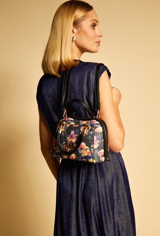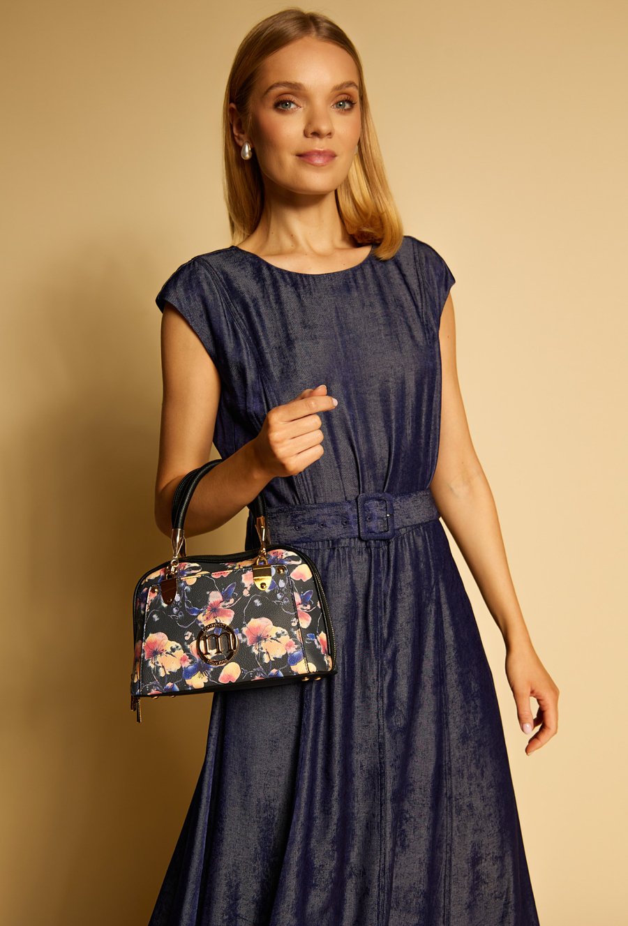 Mały kuferek damski z kwiatowym wzorem, który dodaje mu lekkości i kobiecego uroku. Torba jednokomorowa, z jasną, logowaną podszewką oraz dodatkowymi kieszonkami na drobiazgi, ułatwiającymi organizację. Torba zawieszona na rączkach, a w zestawie znajduje się pasek z regulacją. Model ten świetnie dopełni wiosenno-letnie stylizacje. Torbę należy przechowywać w załączonym woreczku. Wymiary: 30 cm x 19 cm x 11 cm.