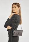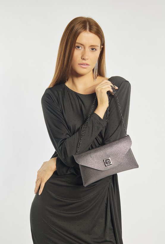 Kompaktowa i szykowna wizytowa torebka z subtelnym połyskiem. Jednokomorowe wnętrze zapinane jest na klapkę z eleganckim zapięciem typu „twist”, zapewniając bezpieczne przechowywanie najważniejszych drobiazgów. Torebka zawieszona jest na delikatnym łańcuszkowym pasku. Torbę należy przechowywać w dołączonym woreczku. Wymiary: 23 cm x 13,5 cm x 3 cm.