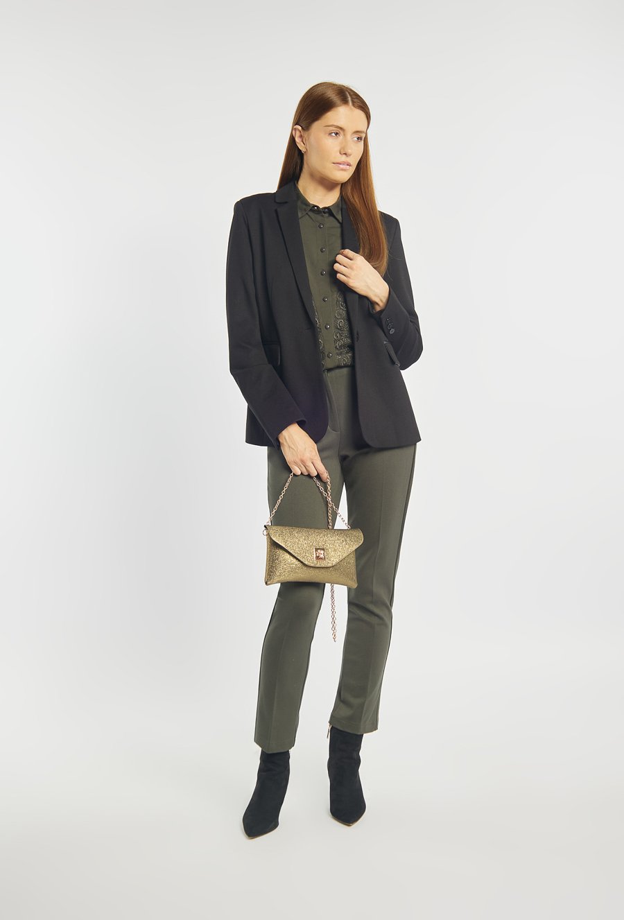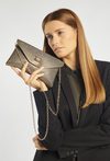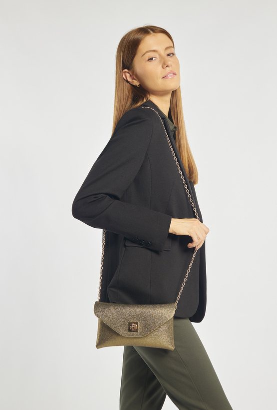 Kompaktowa i szykowna wizytowa torebka z subtelnym połyskiem. Jednokomorowe wnętrze zapinane jest na klapkę z eleganckim zapięciem typu „twist”, zapewniając bezpieczne przechowywanie najważniejszych drobiazgów. Torebka zawieszona jest na delikatnym łańcuszkowym pasku. Torbę należy przechowywać w dołączonym woreczku. Wymiary: 23 cm x 13,5 cm x 3 cm.