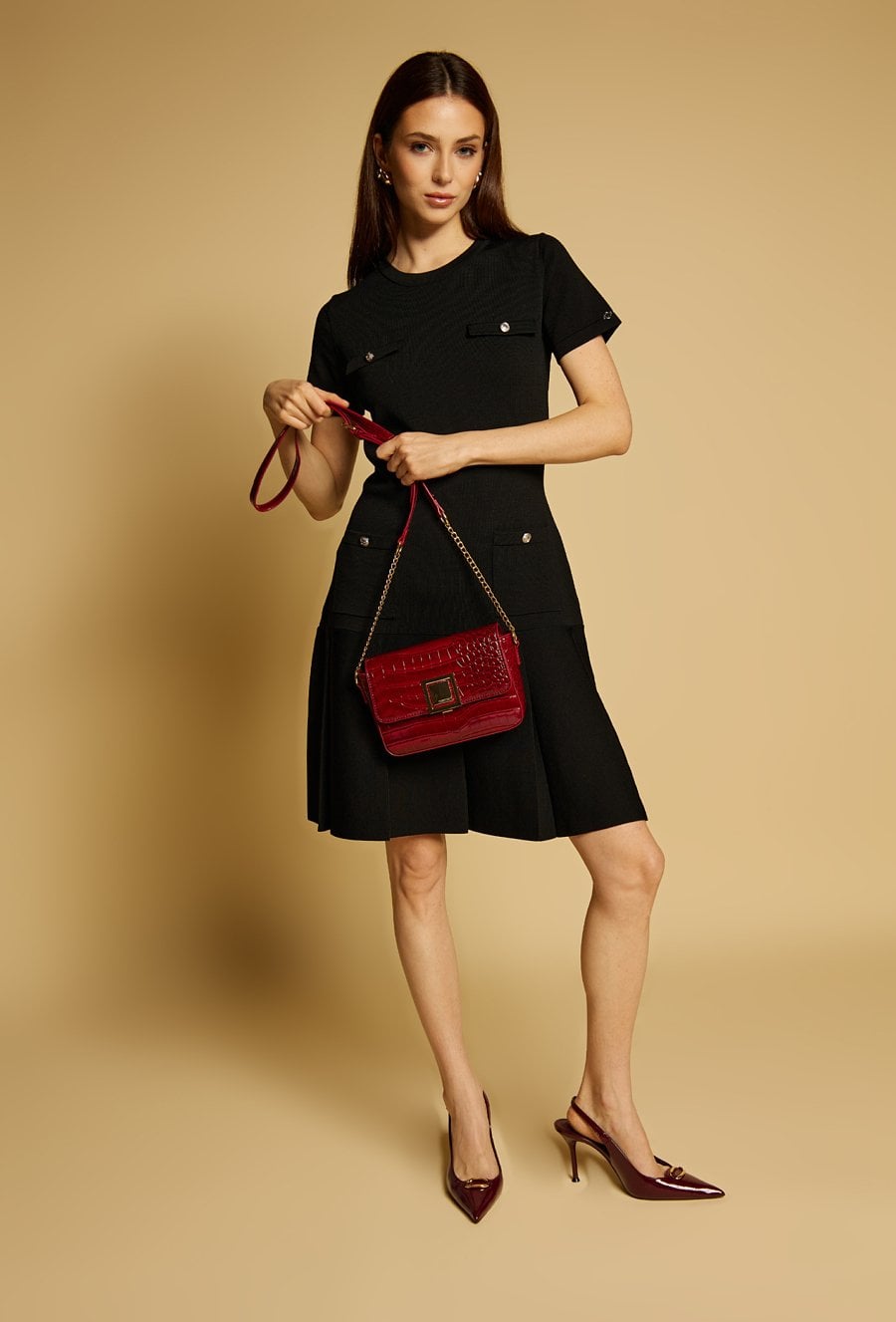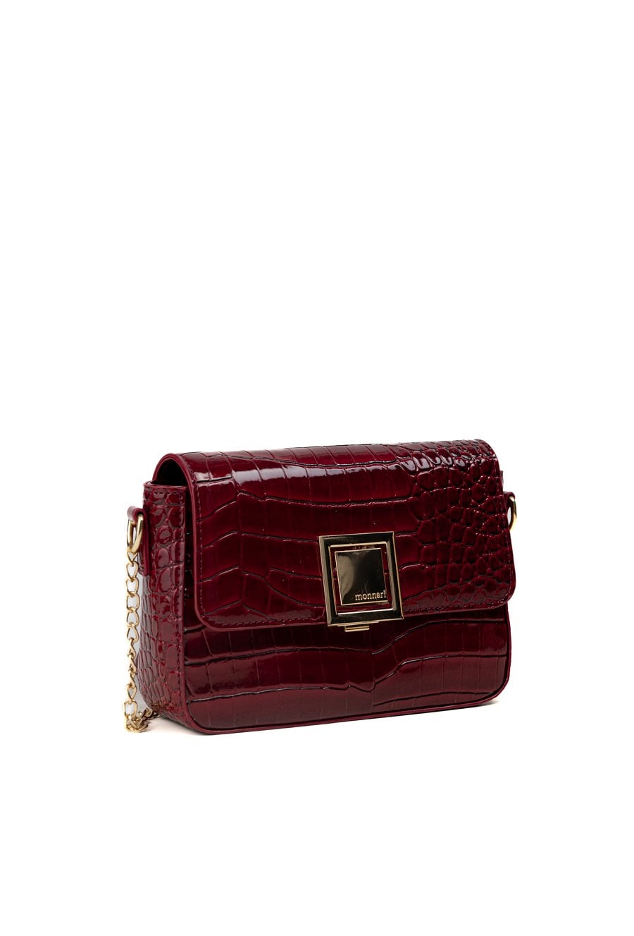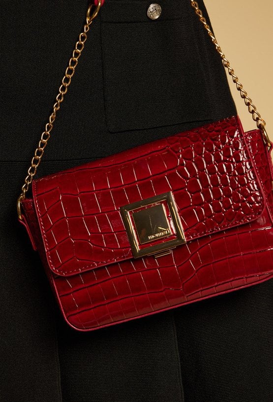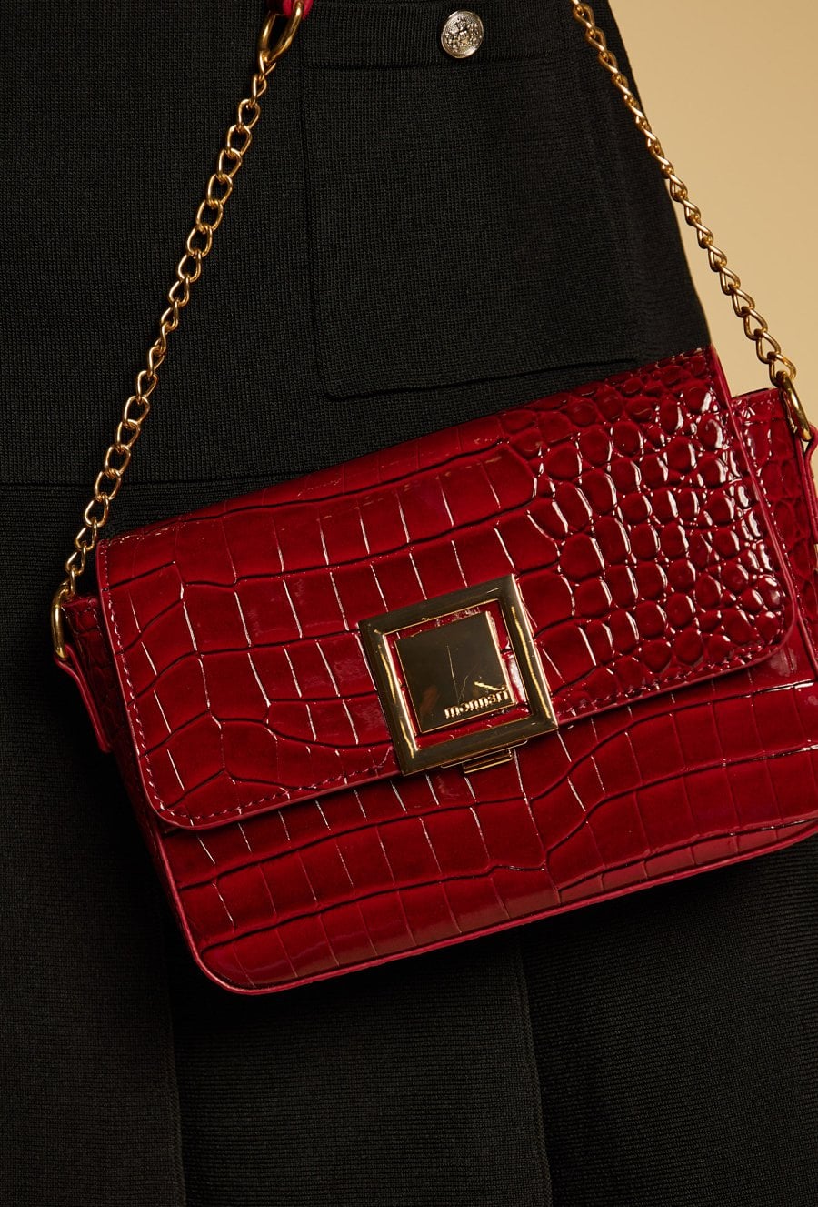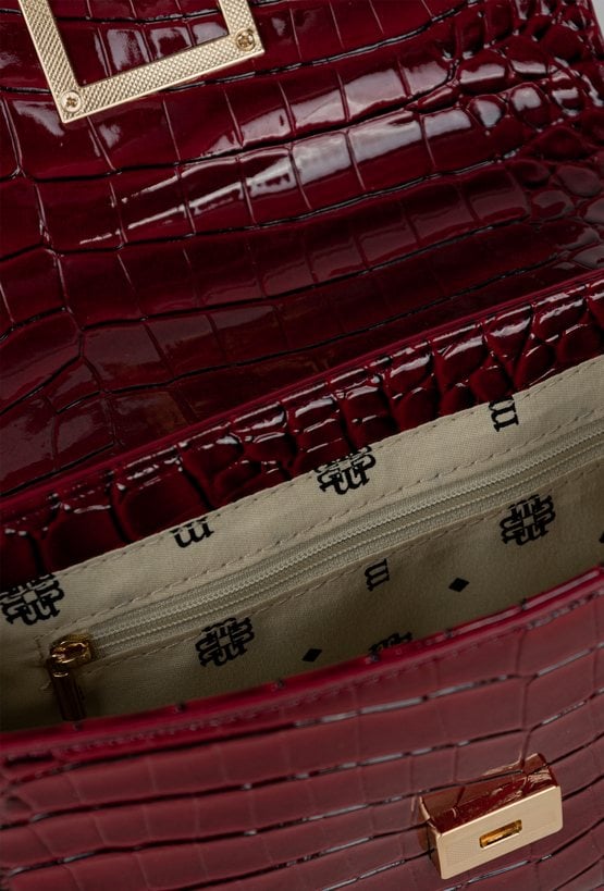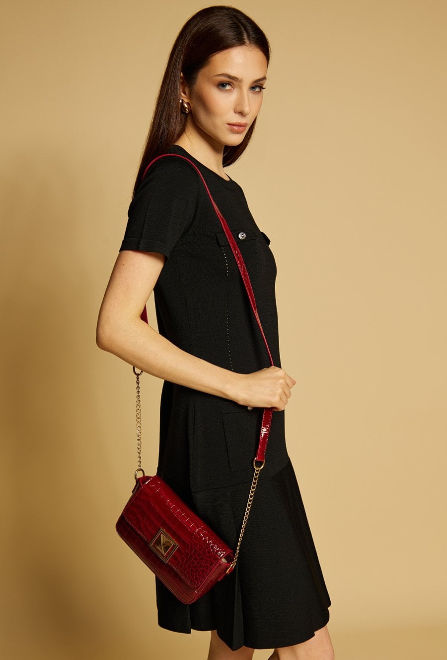 Wizytowa mała torebka damska z delikatnym wzorem. Torba z klapą, jednokomorowa o jasnej, logowanej podszewce z dodatkowymi kieszonkami w środku. Zawieszona na regulowanym pasku z ozdobnym elementem łańcuszka, stanowi stylowy dodatek do wieczorowych i eleganckich stylizacji. Wymiary: 20,5cm x 15cm x 5,5cm