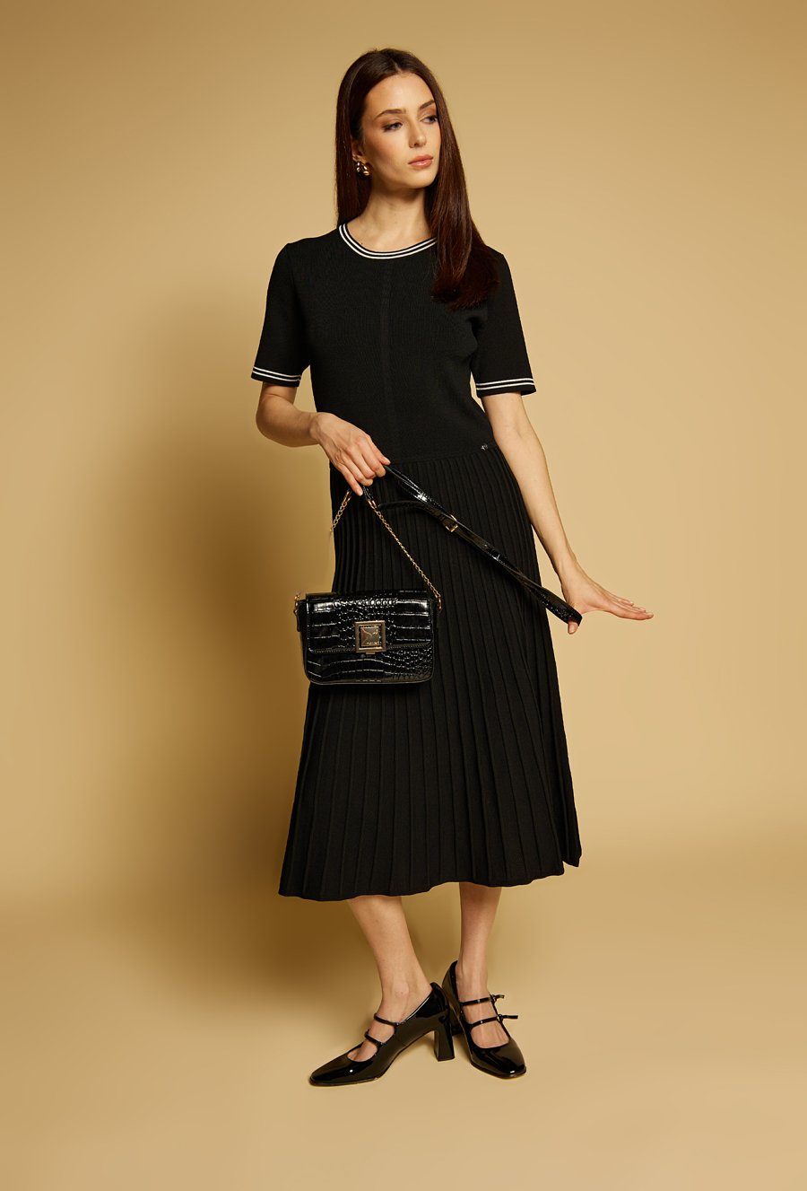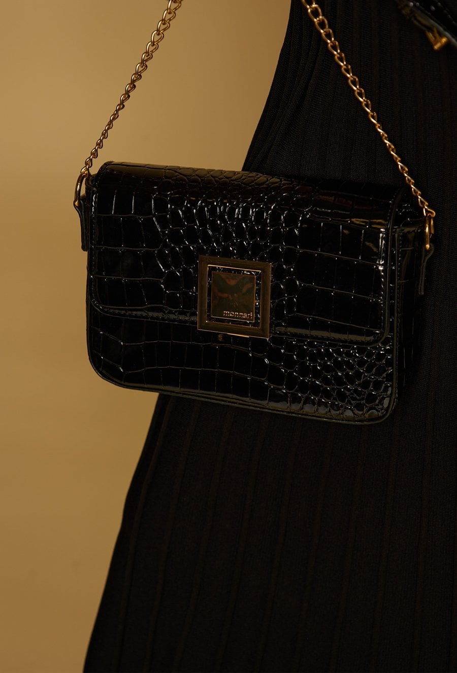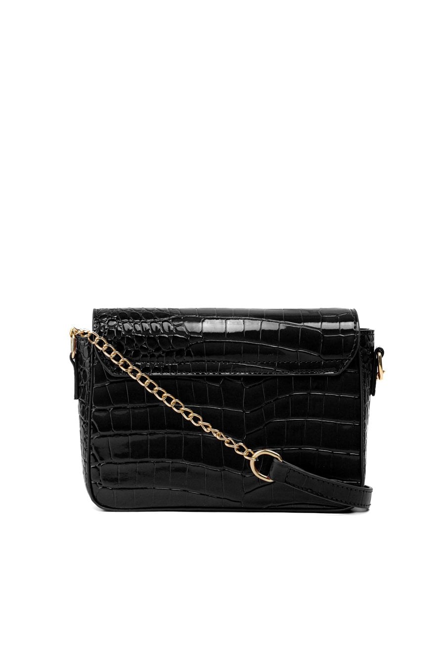 Wizytowa mała torebka damska z delikatnym wzorem. Torba z klapą, jednokomorowa o jasnej, logowanej podszewce z dodatkowymi kieszonkami w środku. Zawieszona na regulowanym pasku z ozdobnym elementem łańcuszka, stanowi stylowy dodatek do wieczorowych i eleganckich stylizacji. Wymiary: 20,5cm x 15cm x 5,5cm