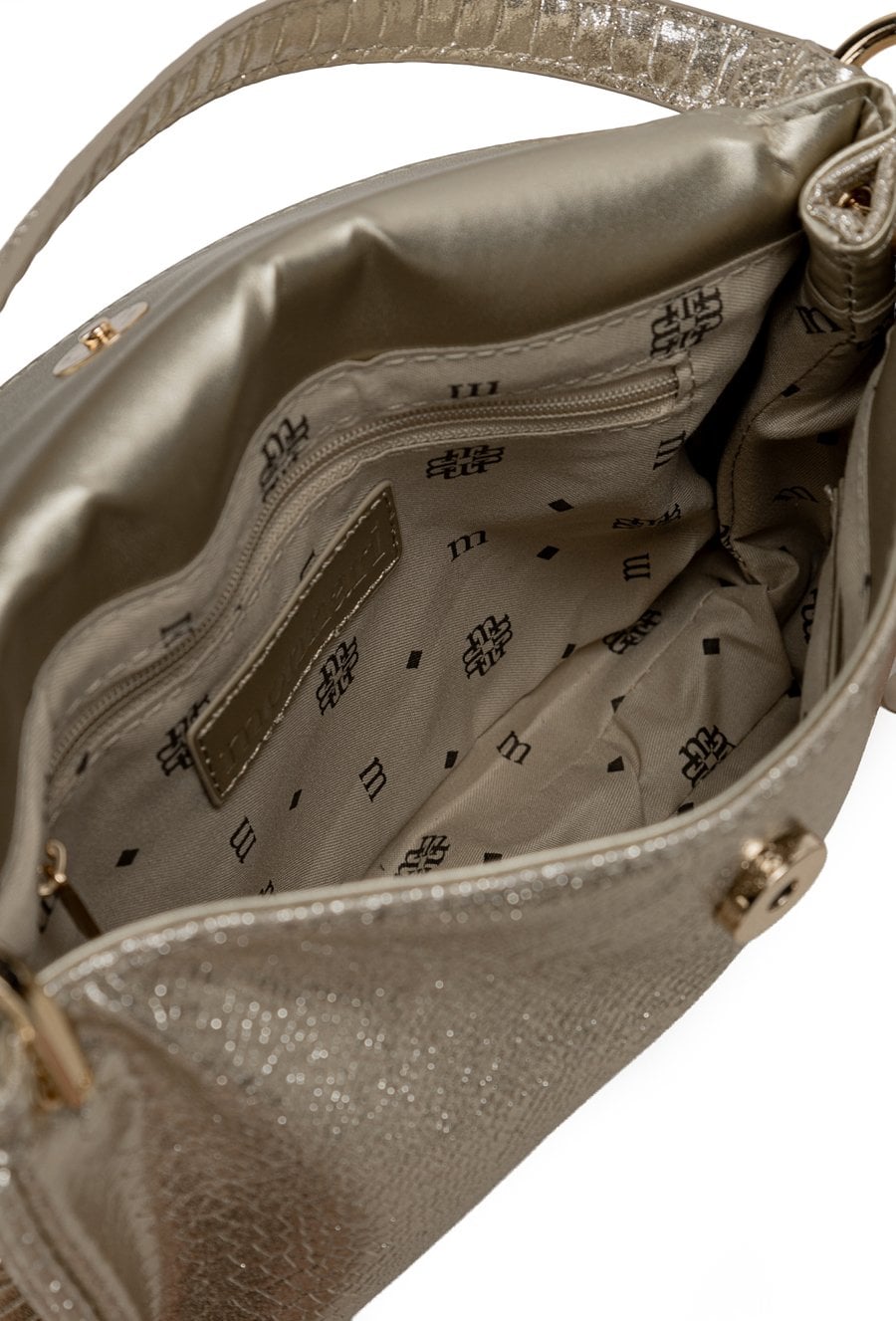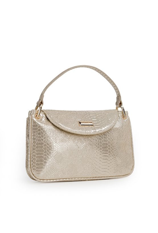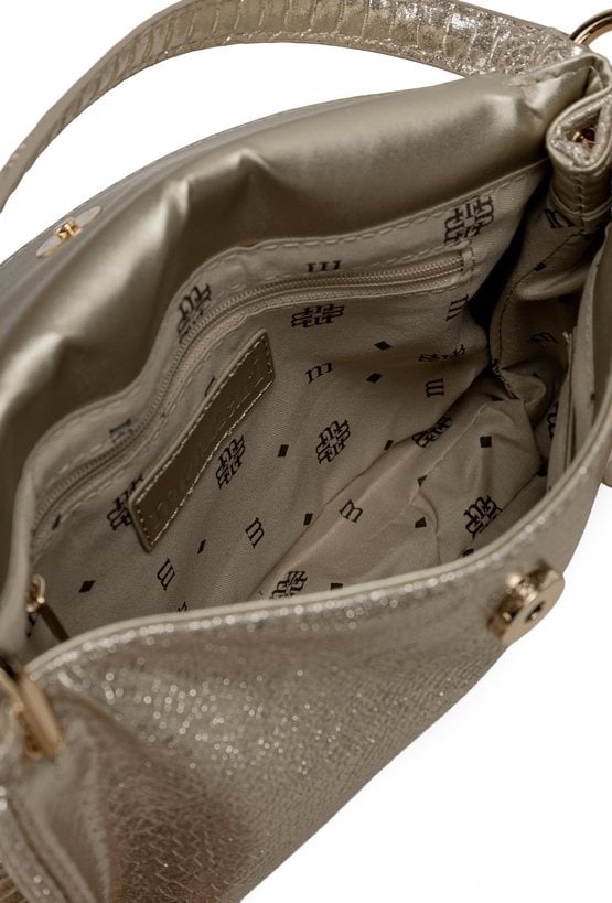Torba damska o wymiarach 24,5 × 14,5 × 4 cm. Jednokomorowy model z jasną, logowaną podszewką oraz dodatkowymi kieszonkami na drobiazgi. Torebka zapinana na małą klapę z napą. W zestawie regulowany, odpinany pasek. Torbę należy przechowywać w dołączonym woreczku.