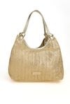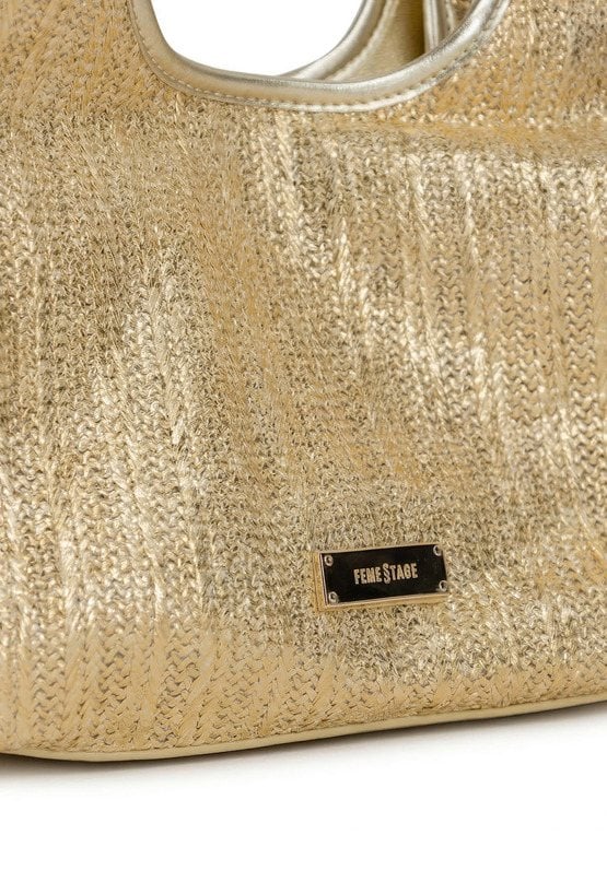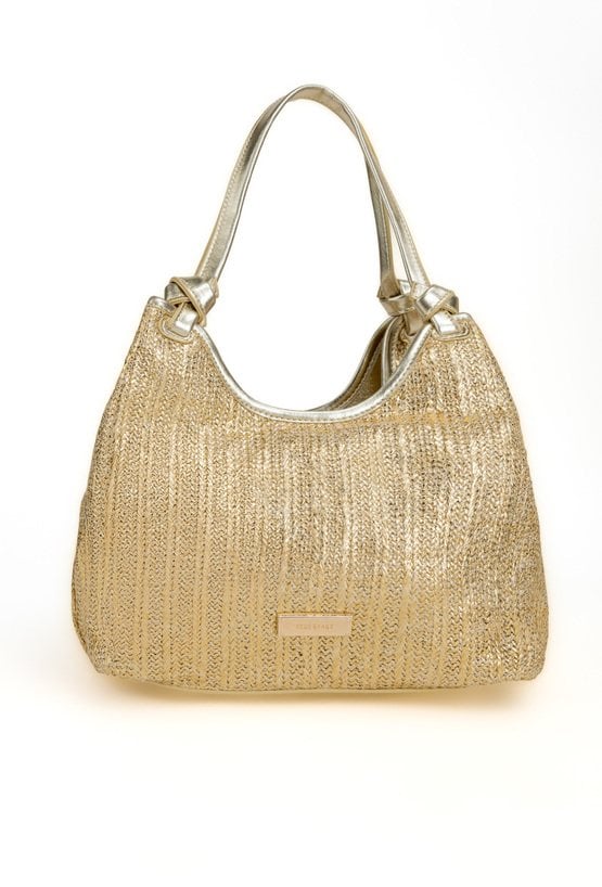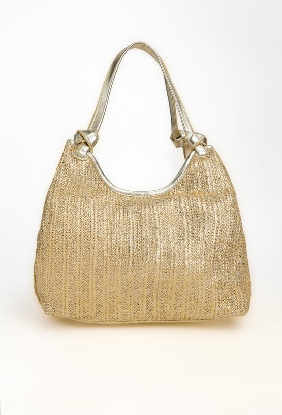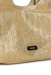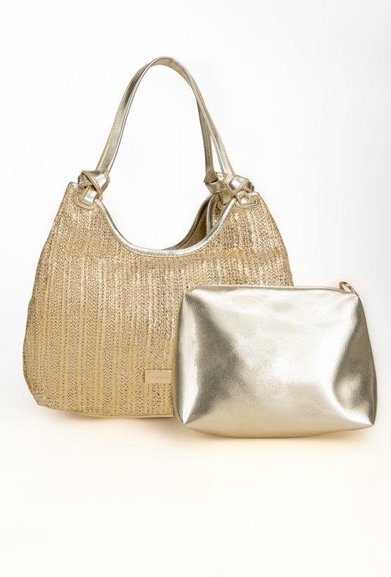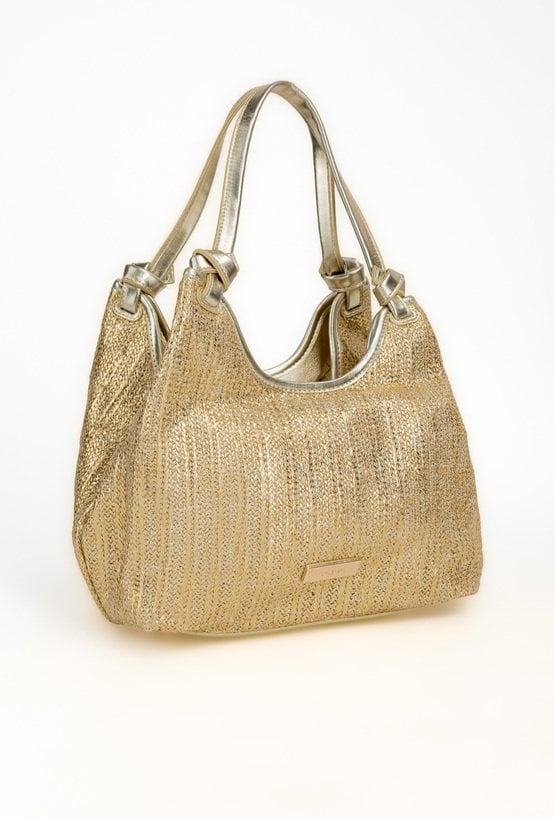 Połyskująca torba damska o wymiarach: 28 cm x 20 cm x 12,5 cm. Torba jednokomorowa o jasnej, logowanej podszewce z dodatkową małą torebką. Torba zawieszona na rączkach. W zestawie regulowany, odpinany pasek, który można przypiąć zarówno do większej, jak i mniejszej torby.