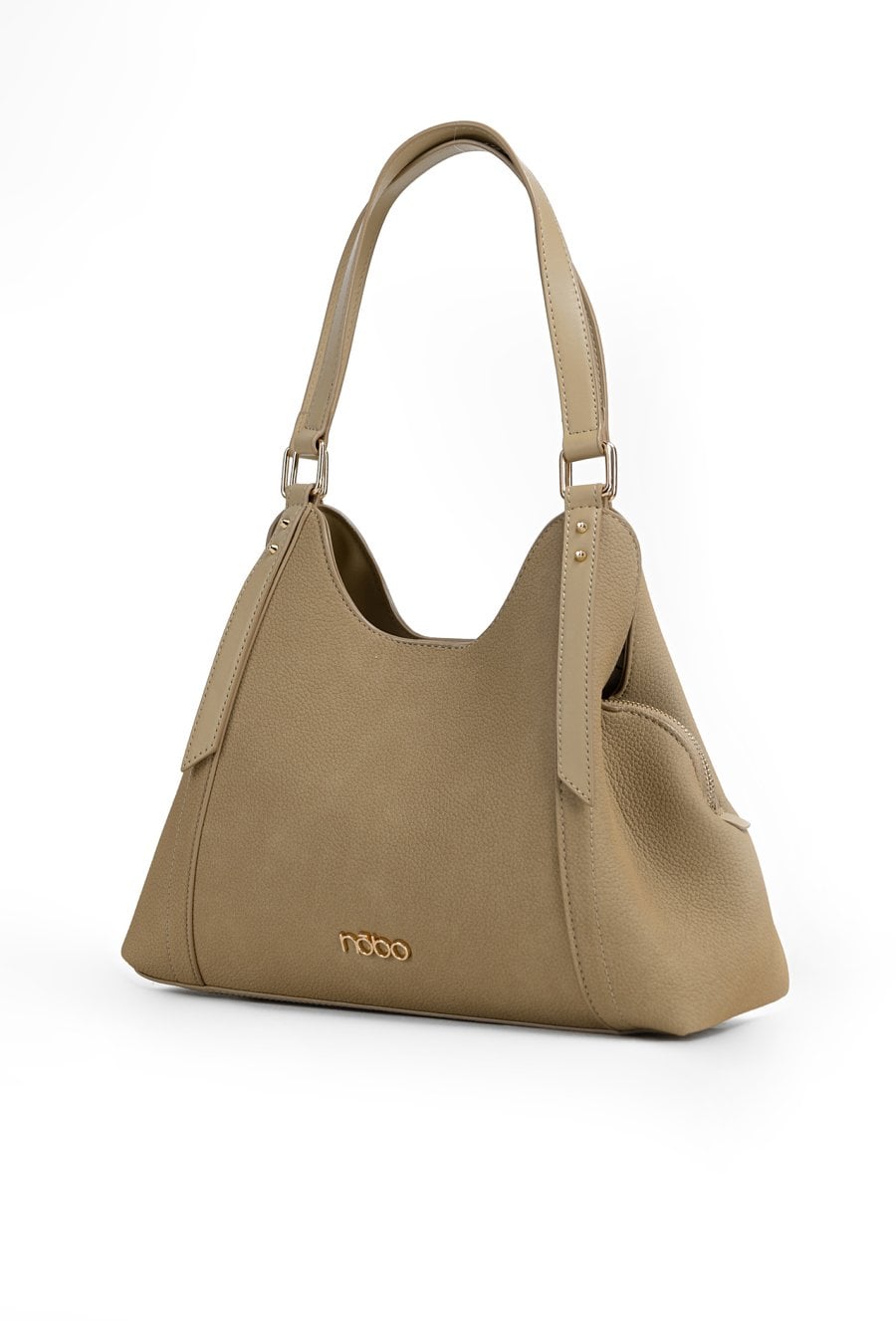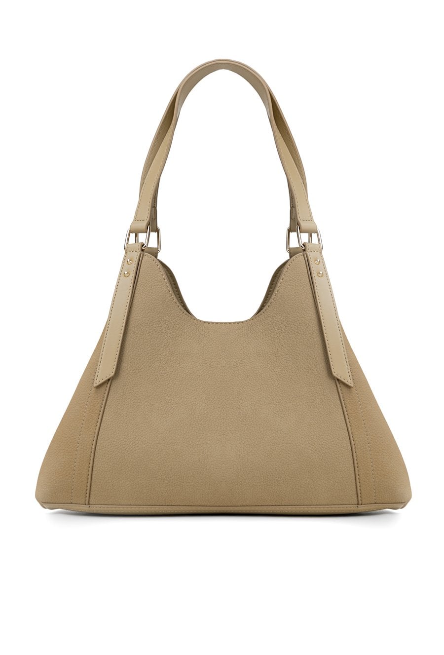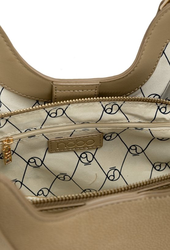 Torba damska typu worek o wymiarach 32 × 20,5 × 9,5 cm. Model trzykomorowy z jasnymi, logowanymi podszewkami oraz dodatkowymi kieszonkami na drobiazgi. Jedna komora zapinana na suwak, a dwie pozostałe na napę. Torba zawieszona na rączkach. Torbę należy przechowywać w dołączonym woreczku.