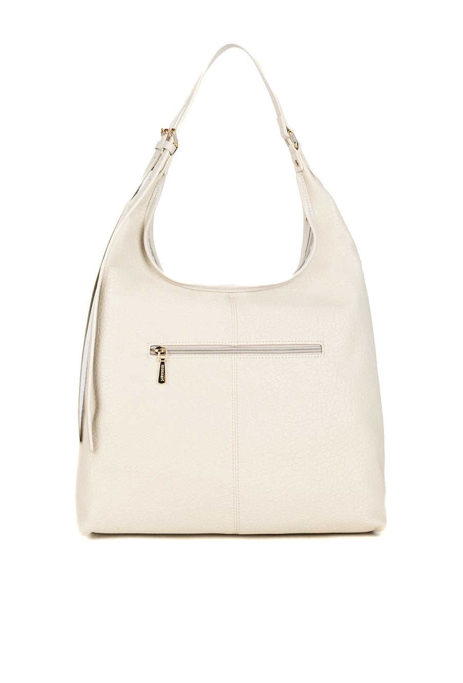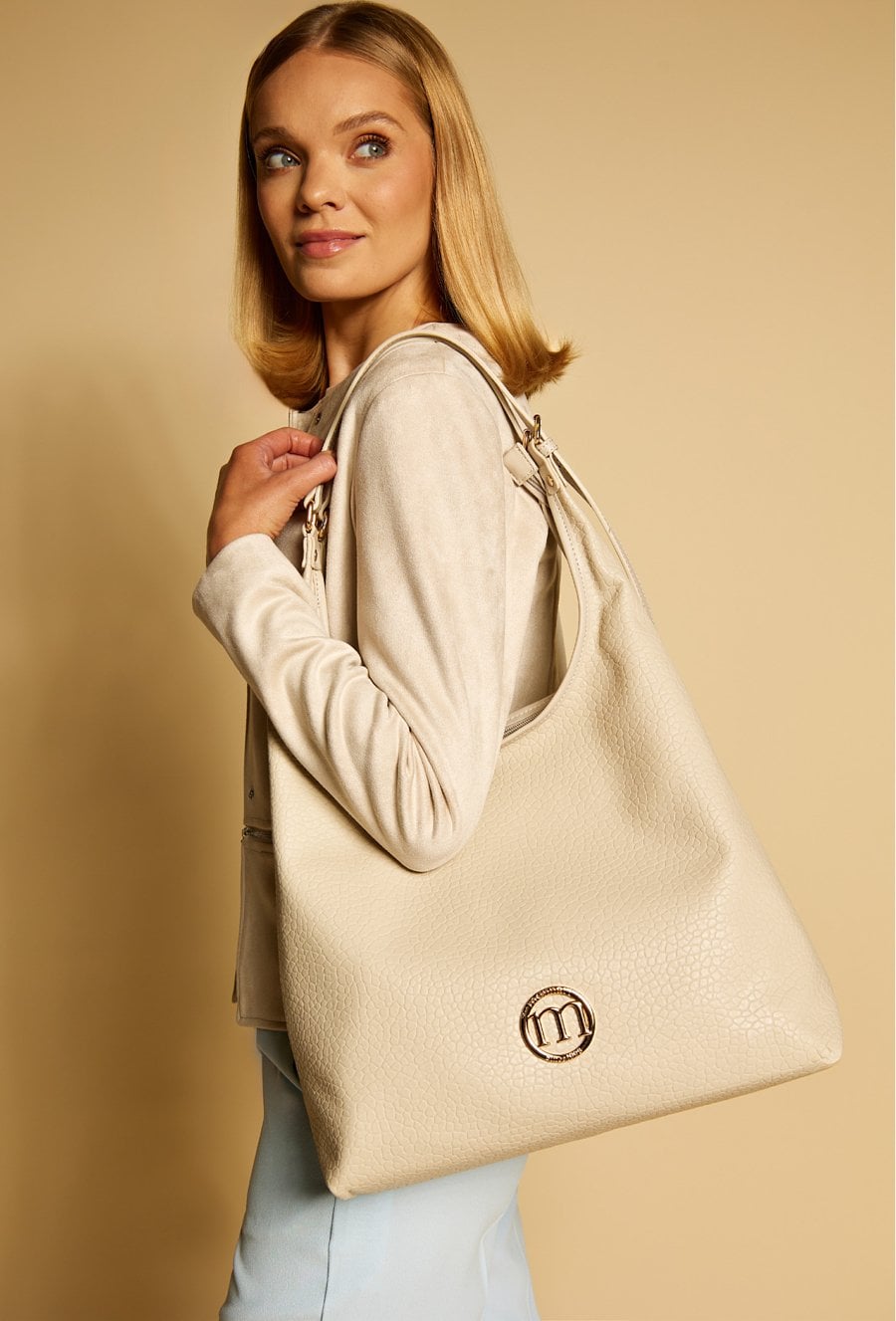 Damska torba typu worek, jednokomorowa, z jasną podszewką ozdobioną logo Monnari. Zapinana na suwak, zapewnia wygodę, bezpieczeństwo i porządek w przechowywaniu. Wyposażona w liczne kieszenie, które ułatwiają organizację niezbędnych drobiazgów. Torba zawieszona na regulowanej rączce. Torbę należy przechowywać w dołączonym woreczku. Wymiary: 40 cm x 30 cm x 12 cm.