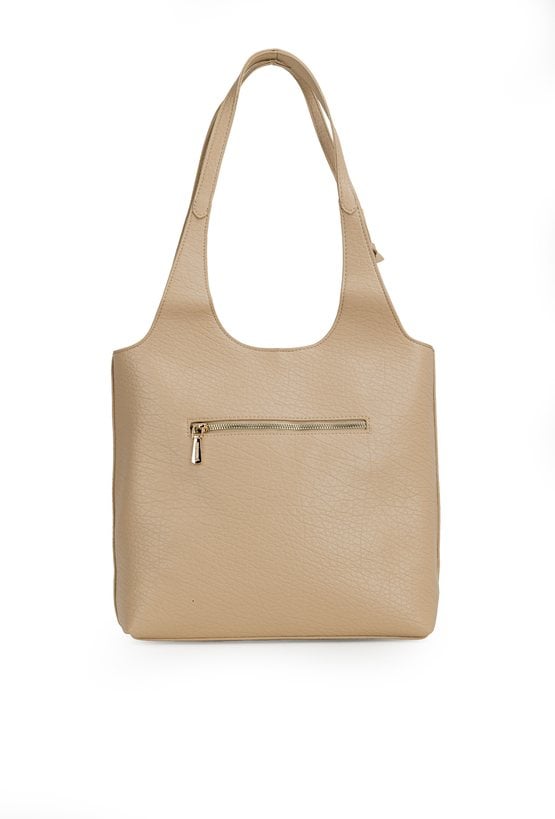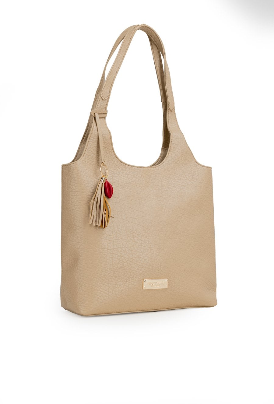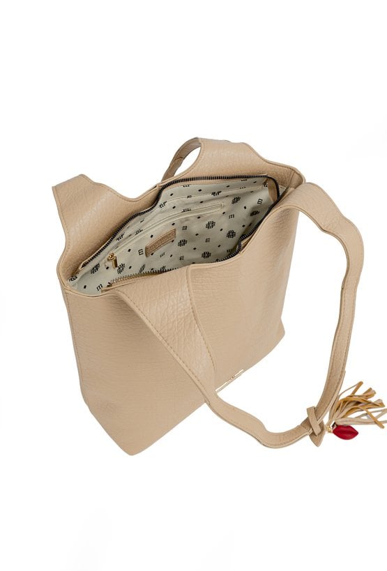 Torba damska typu shopper o wymiarach 35 × 30 × 13 cm to pojemny model idealny na co dzień. Torba ma jednokomorowe wnętrze z dodatkowymi kieszonkami na drobiazgi, które ułatwiają organizację. Torba zawieszona na rączkach wyróżnia się stylową przywieszką z frędzlami umieszczoną przy jednej z nich. Torbę należy przechowywać w dołączonym woreczku.