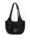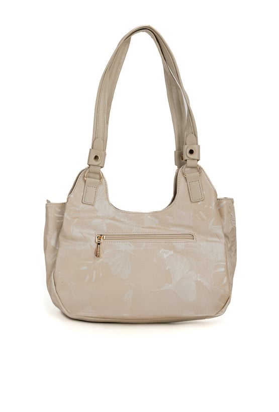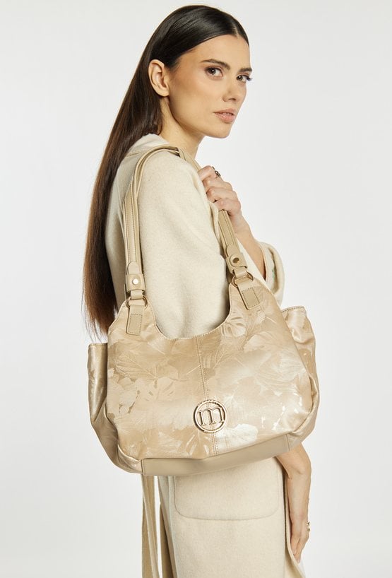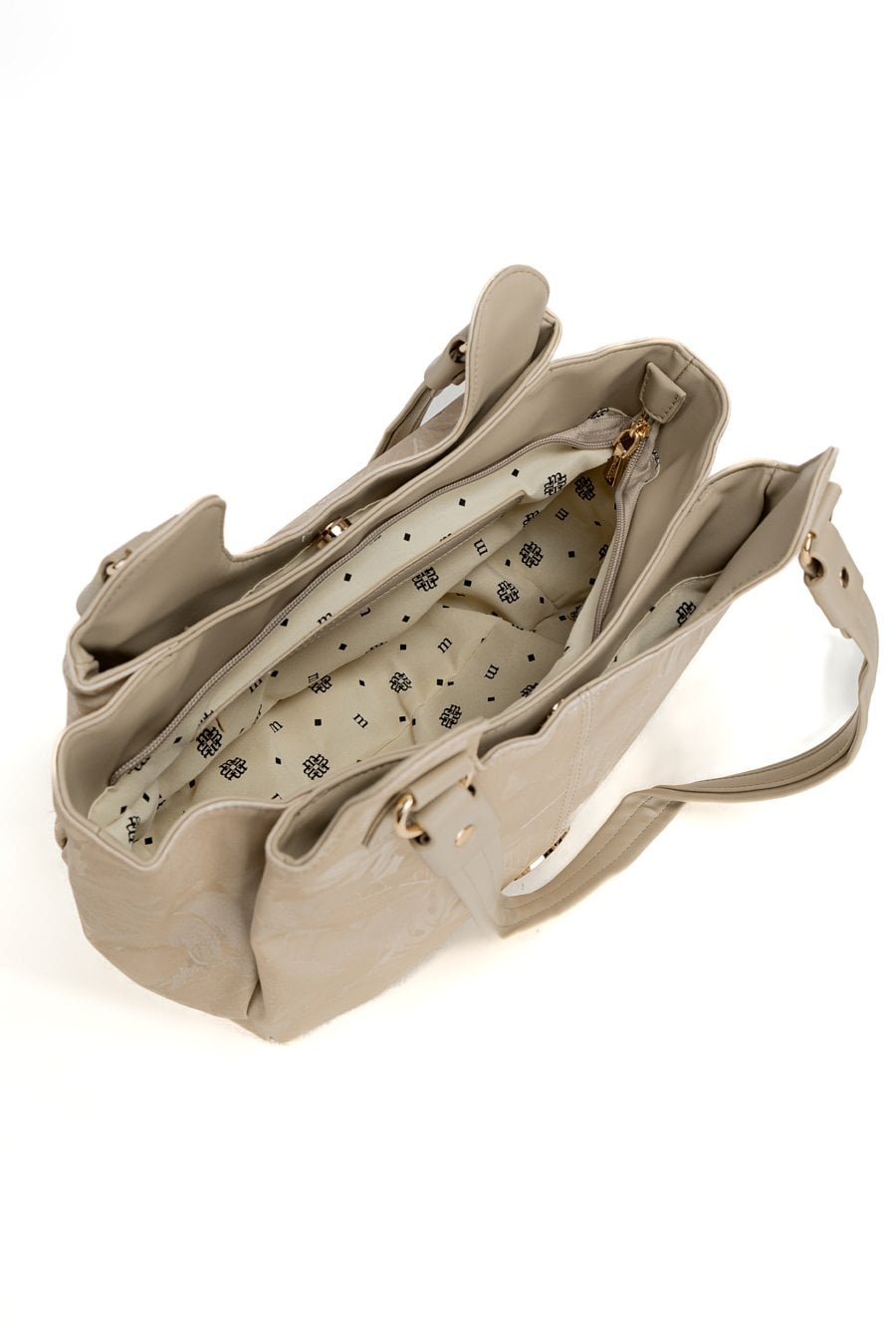 Torba damska typu worek z delikatnym wzorem to praktyczny i pojemny model na co dzień. Torba jest trzykomorowa, ma jasne, logowane wnętrza oraz dodatkowe kieszonki na drobiazgi, które ułatwiają organizację. Torba ma dwie komory zapinane na napy oraz środkową komorę na suwak, co zapewnia wygodę i bezpieczne przechowywanie rzeczy, a rączki gwarantują komfort noszenia w dłoni lub na przedramieniu. Torbę należy przechowywać w dołączonym woreczku. Wymiary: 38 cm x 20 cm x 13 cm.