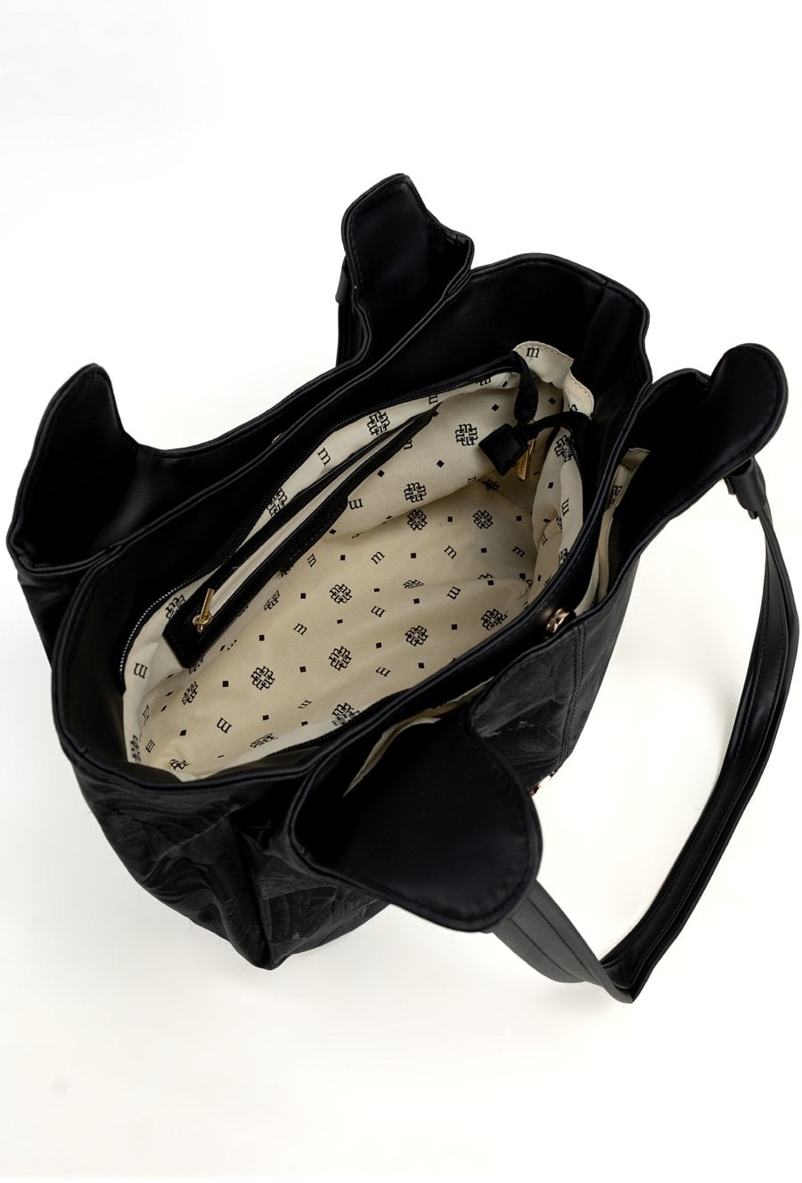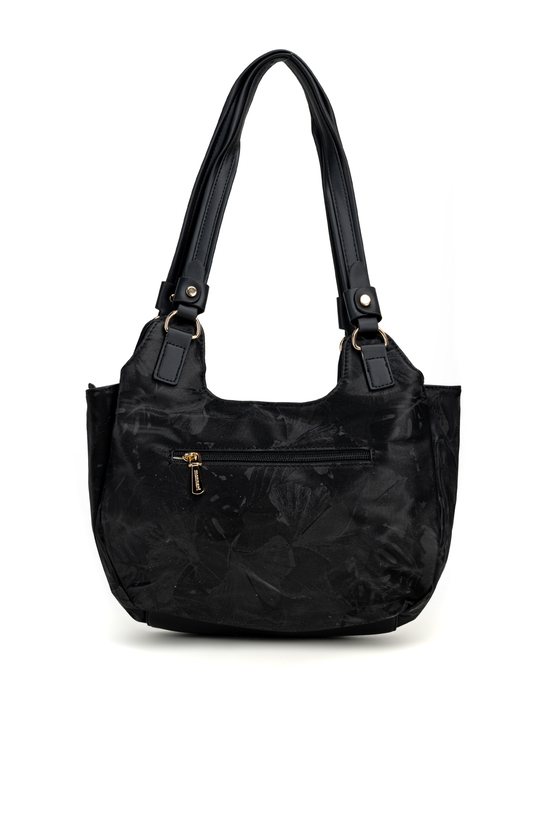 Torba damska typu worek z delikatnym wzorem to praktyczny i pojemny model na co dzień. Torba jest trzykomorowa, ma jasne, logowane wnętrza oraz dodatkowe kieszonki na drobiazgi, które ułatwiają organizację. Torba ma dwie komory zapinane na napy oraz środkową komorę na suwak, co zapewnia wygodę i bezpieczne przechowywanie rzeczy, a rączki gwarantują komfort noszenia w dłoni lub na przedramieniu. Torbę należy przechowywać w dołączonym woreczku. Wymiary: 38 cm x 20 cm x 13 cm.