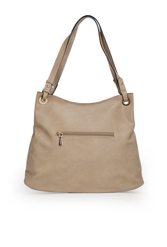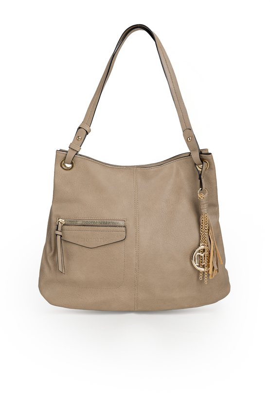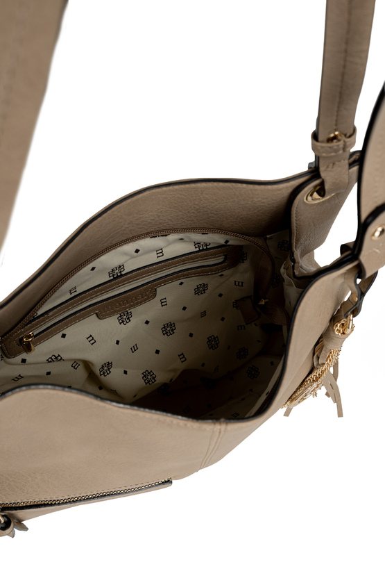 Torba damska o wymiarach 38 × 30,5 × 8 cm to praktyczny i stylowy model na co dzień. Torba jest jednokomorowa, ma jasną, logowaną podszewkę oraz dodatkowe kieszonki na drobiazgi, które ułatwiają organizację. Torba wyróżnia się efektowną przywieszką z logo marki z frędzlami i łańcuszkami, która dodaje jej charakteru. Torba zawieszona na rączce. Torbę należy przechowywać w dołączonym woreczku.