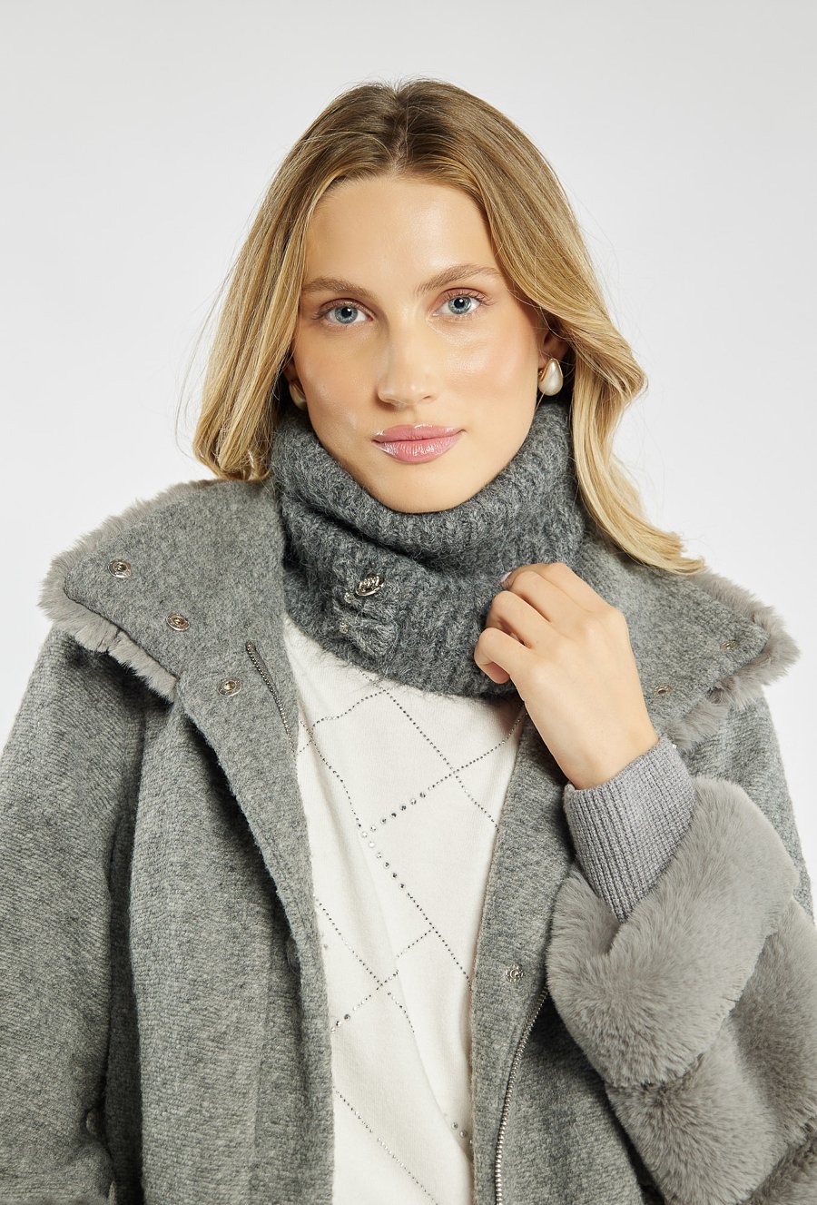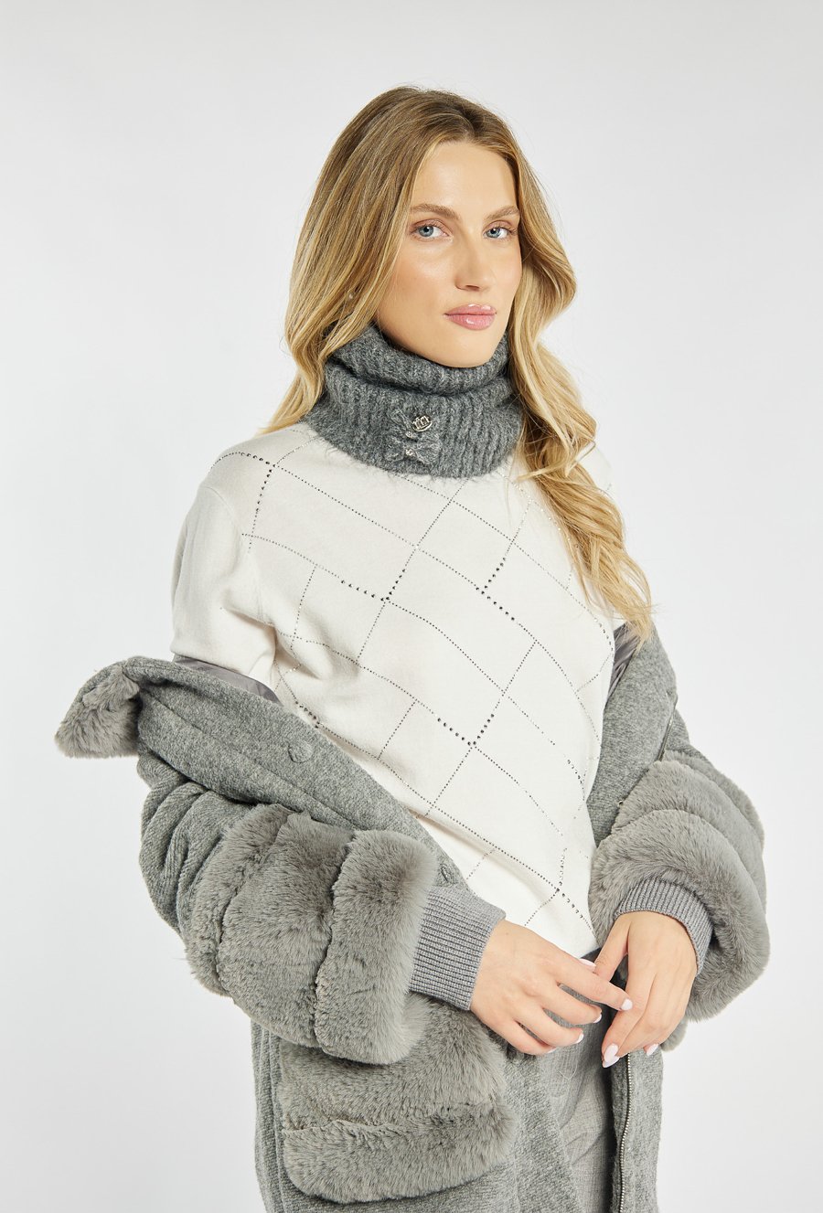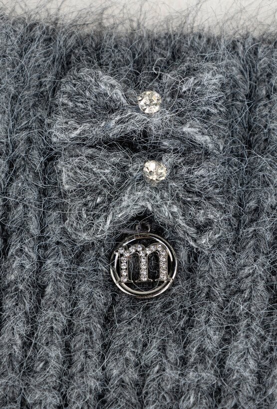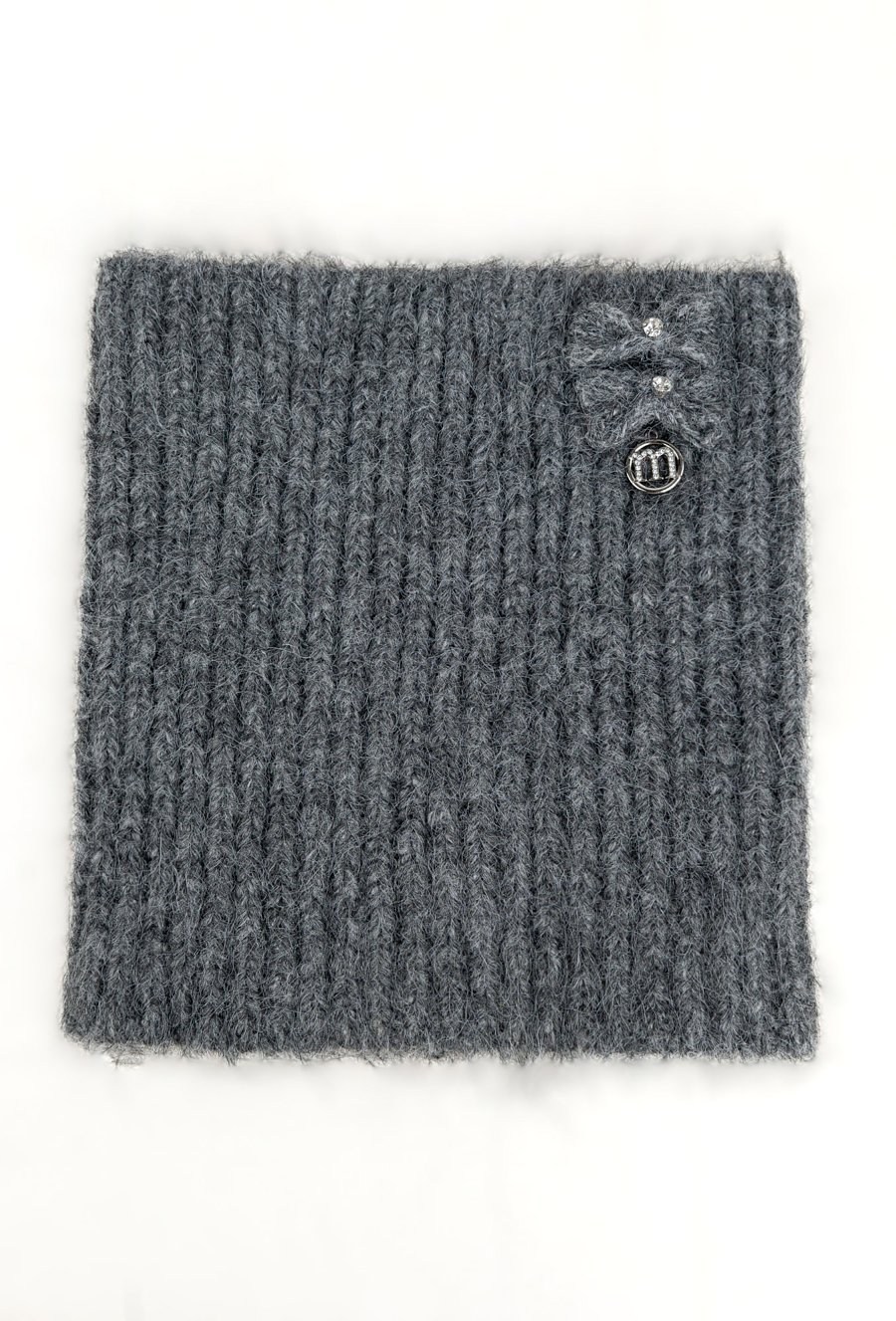 Stylowy szary golf-komin ozdobiony subtelną aplikacją w kształcie kokardki z błyszczącymi dżetami. Doskonale chroni przed chłodem, jednocześnie dodając elegancji każdej stylizacji. Idealny na jesień i zimę
