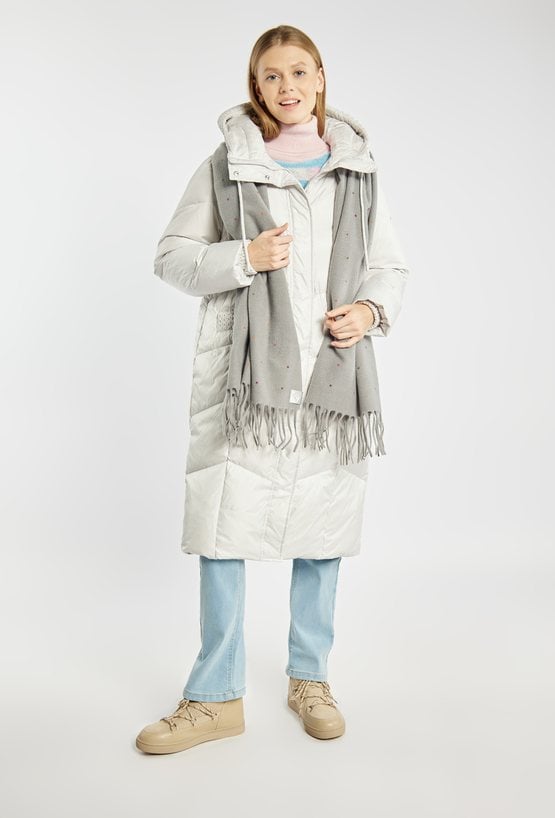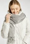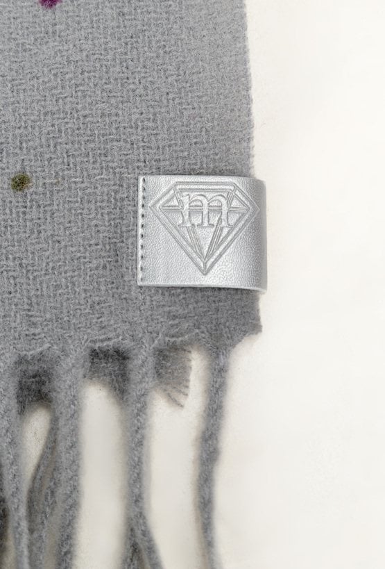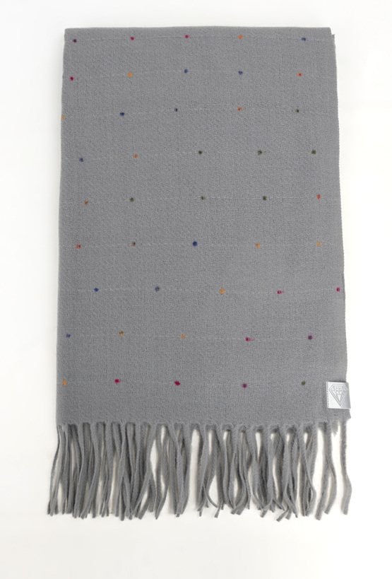 Szalik damski w stonowanym odcieniu szarości, ozdobiony drobnymi, kolorowymi akcentami. Wykończony klasycznymi frędzlami, które dodają mu lekkości i swobodnego charakteru. Miękki i ciepły, doskonale sprawdzi się w chłodne, jesienno-zimowe dni.