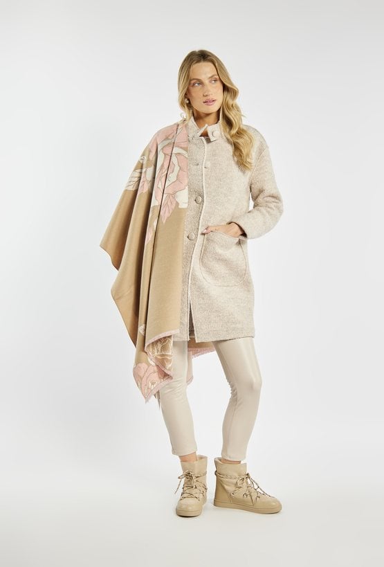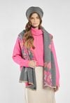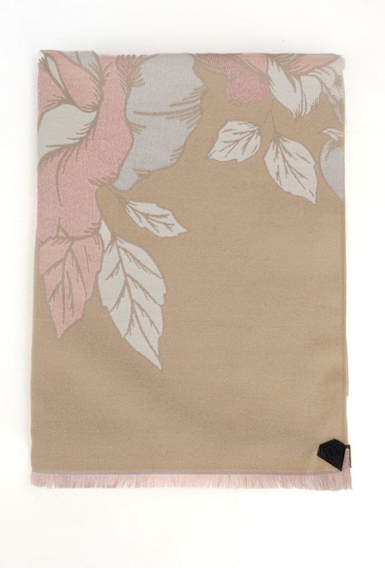 Szalik damski o miękkiej, przyjemnej w dotyku fakturze. Ozdobiony dużym, kwiatowym wzorem w kontrastowych kolorach, który nadaje całości eleganckiego charakteru.