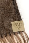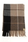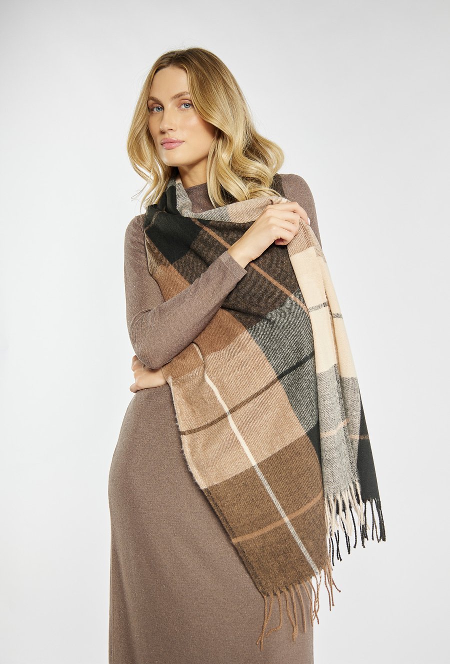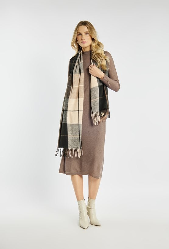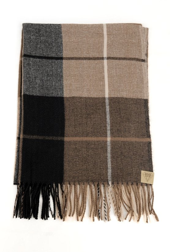 Klasyczny szalik w dużą kratę, utrzymany w ciepłych odcieniach brązu, beżu i czerni. Miękki, przyjemny w dotyku materiał zapewnia komfort i ochronę przed chłodem. Frędzle na końcach dodają mu swobodnego charakteru.