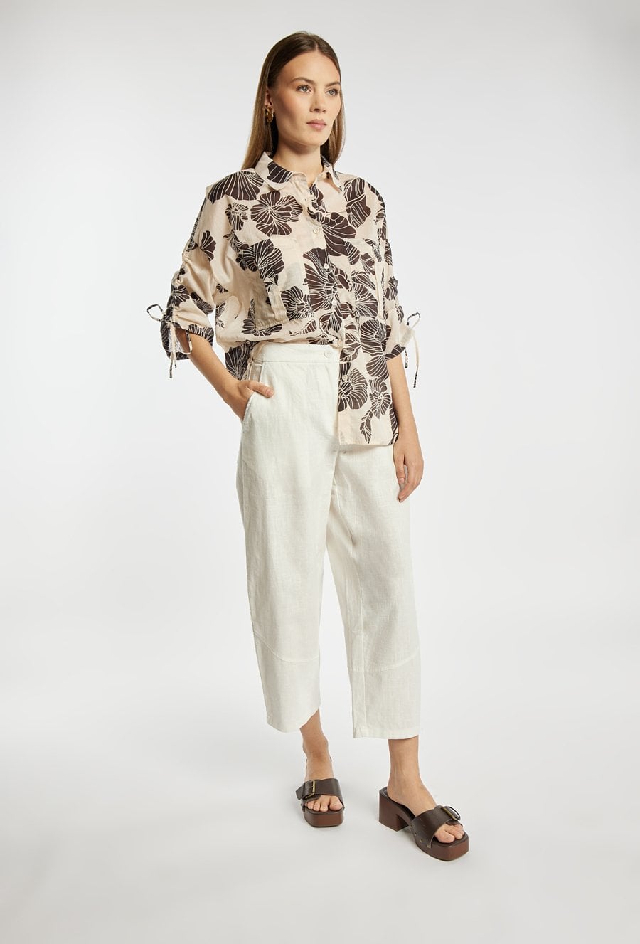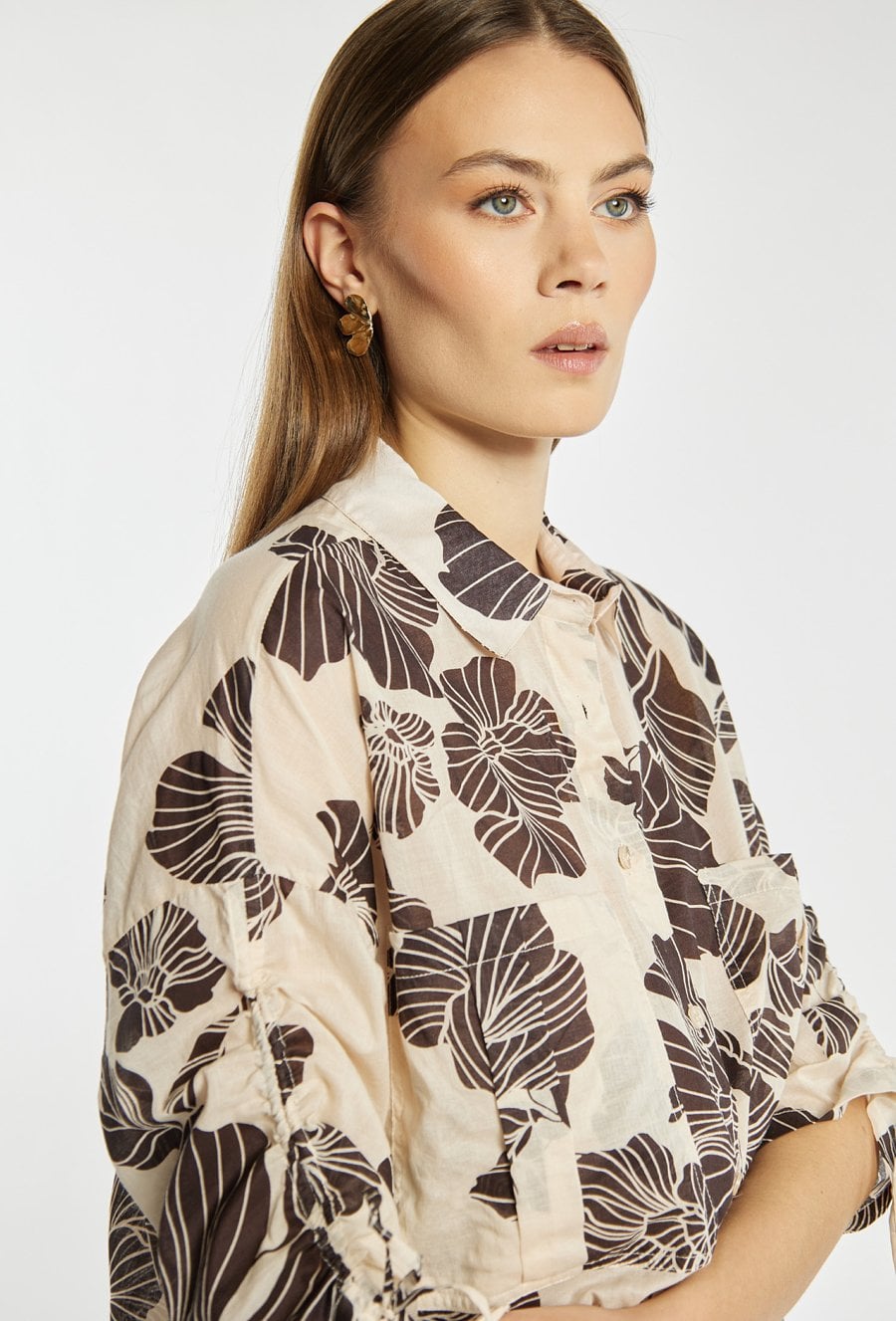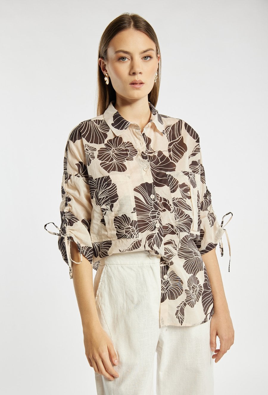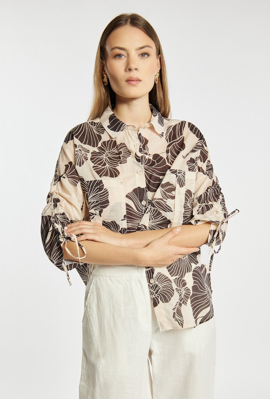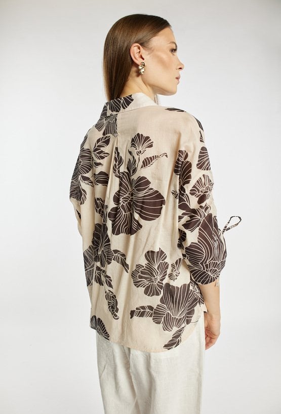 Koszula damska o luźnym, komfortowym kroju z rękawem o długości 3/4. Model zapinany na guziki, z klasycznym kołnierzykiem, który nadaje całości ponadczasowego charakteru. Rękawy wykończone ściągaczem oraz ozdobnym wiązaniem. Całość zdobi efektowny, roślinny wzór, nadający stylizacji wyrazistości. Idealna do codziennych i letnich stylizacji. Modelka na zdjęciu ma 177 cm wzrostu i prezentuje rozmiar 36.
