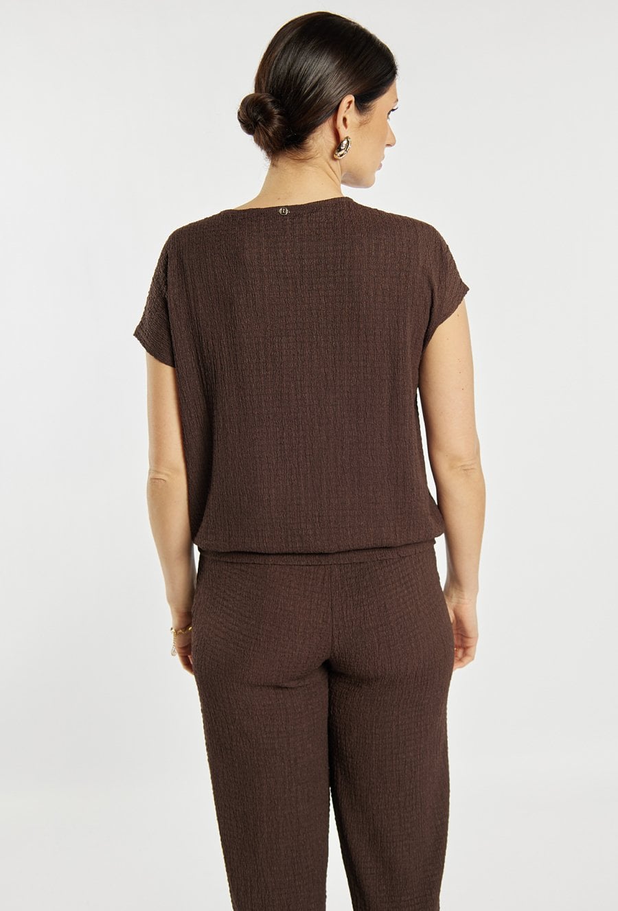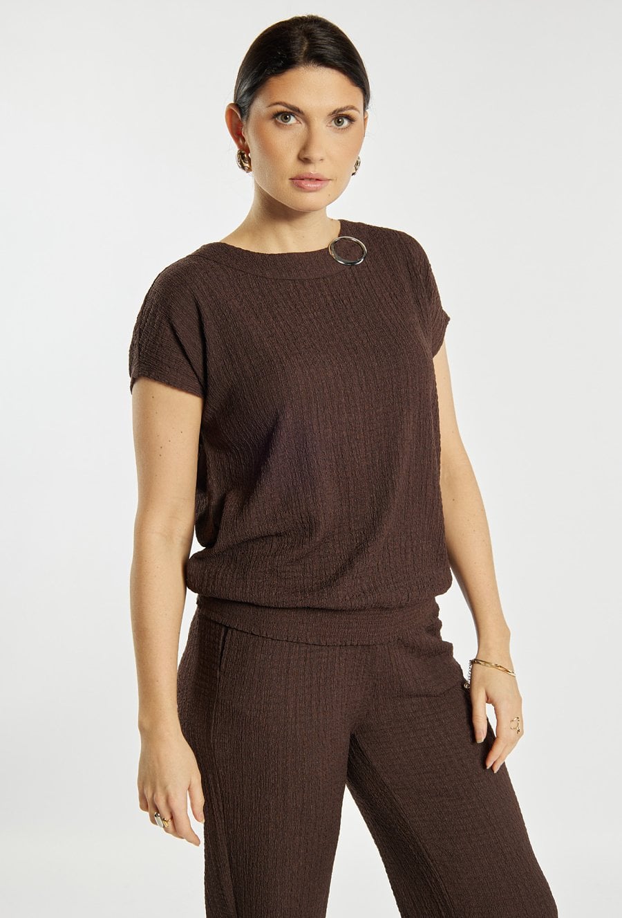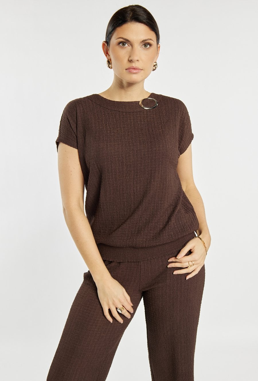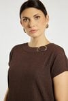 Bluzka damska o prostym, wygodnym kroju. Model z krótkim rękawem i klasycznym, półokrągłym dekoltem. Gładką tkaninę uzupełnia ozdobny detal w postaci metalowego elementu przy dekolcie, który nadaje całości nowoczesnego charakteru. Bluzka damska doskonale sprawdzi się w codziennych oraz bardziej eleganckich stylizacjach. Modelka na zdjęciu ma 177 cm wzrostu i prezentuje rozmiar S.