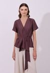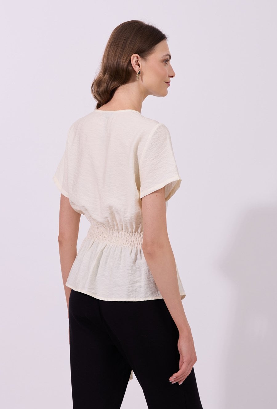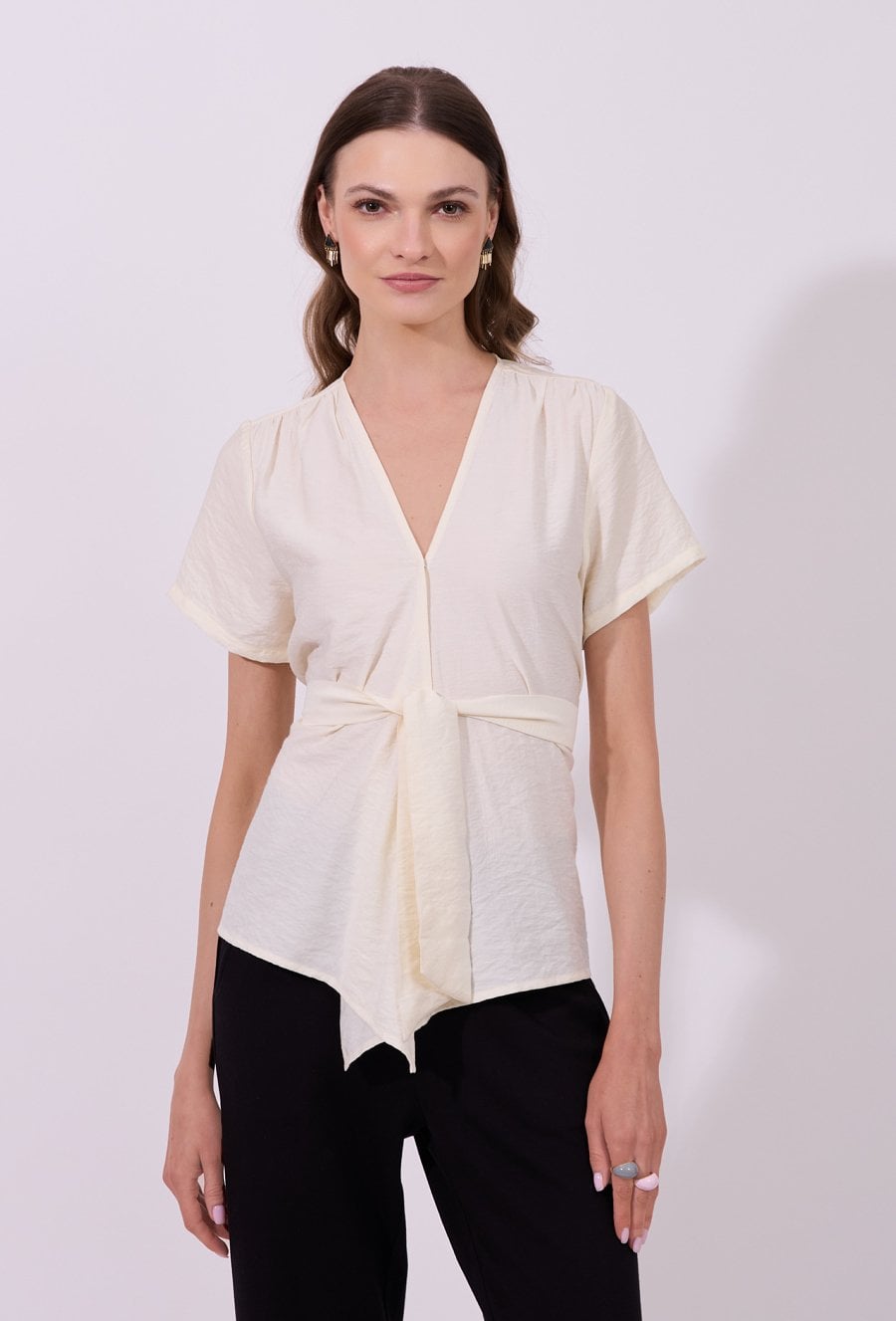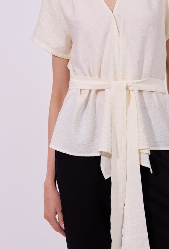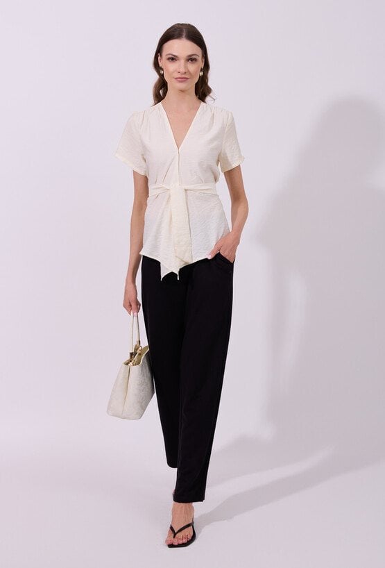 Bluzka damska o kobiecym, lekko dopasowanym kroju z krótkim rękawem. Model z dekoltem w kształcie litery V, który subtelnie podkreśla linię szyi. W talii zastosowano efektowne wiązanie, które akcentuje sylwetkę i nadaje całości stylowego charakteru. Modelka na zdjęciu ma 177 cm wzrostu i prezentuje rozmiar 36.