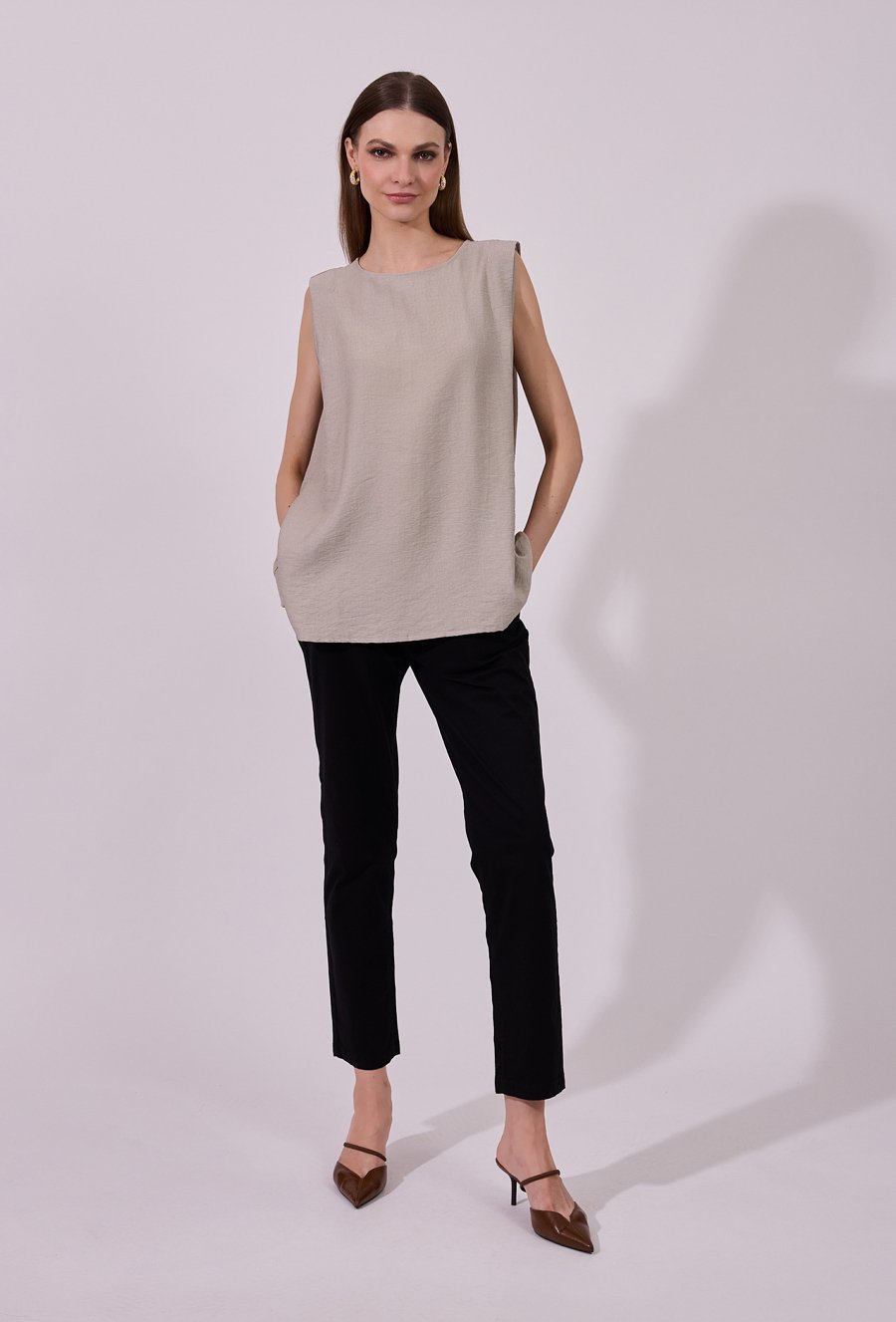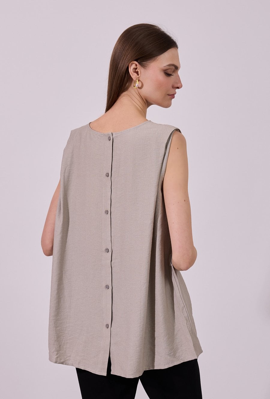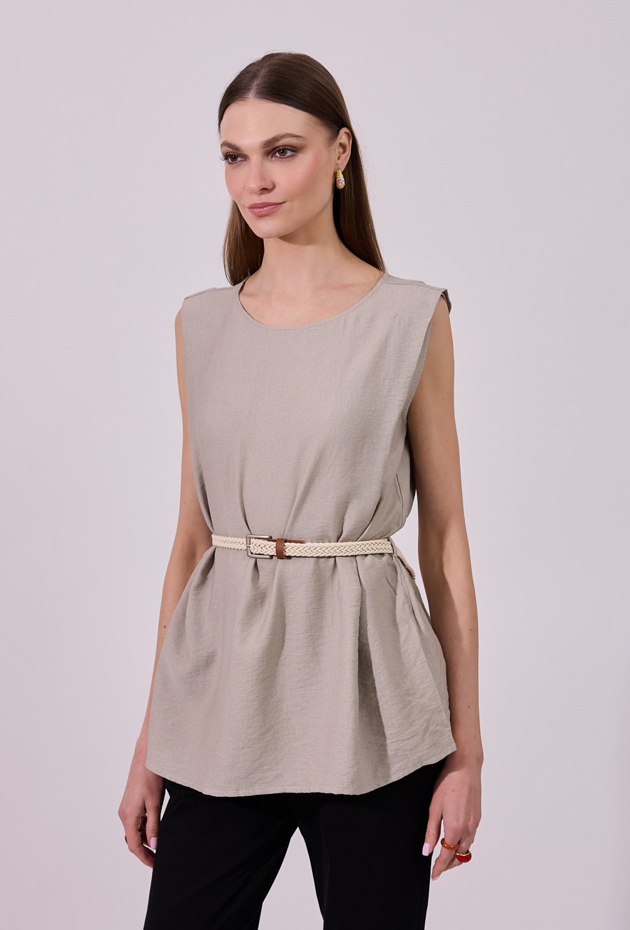 Bluzka damska o luźnym, lekko rozkloszowanym kroju bez rękawów. Model z klasycznym, okrągłym dekoltem, wzbogacony paskiem w talii, który podkreśla sylwetkę i nadaje całości kobiecego charakteru. Delikatne marszczenia dodają lekkości, a zapięcie na guziki z tyłu stanowi subtelny, stylowy detal. Doskonała propozycja zarówno do codziennych, jak i bardziej eleganckich stylizacji. Modelka na zdjęciu ma 177 cm wzrostu i prezentuje rozmiar 36.