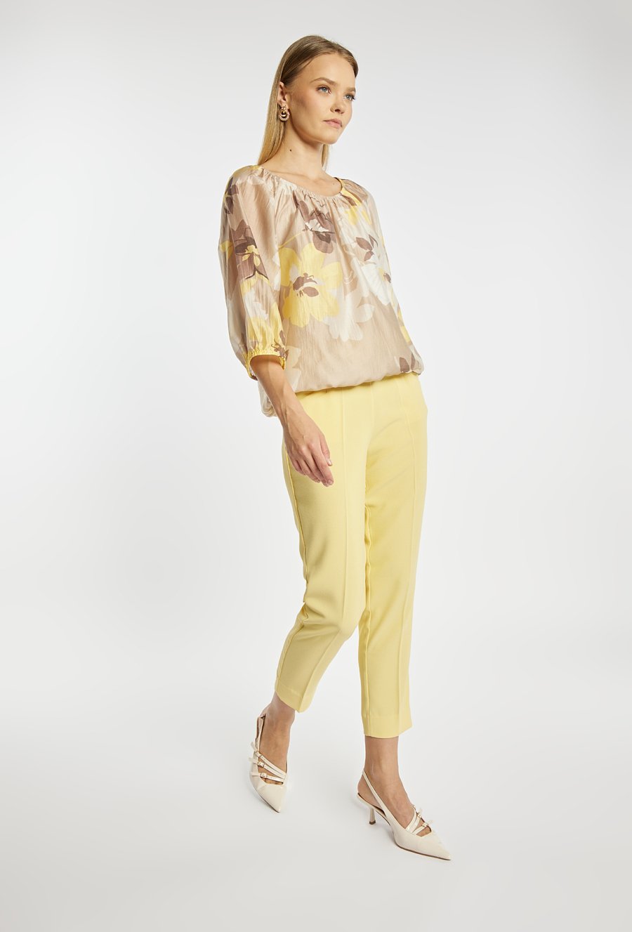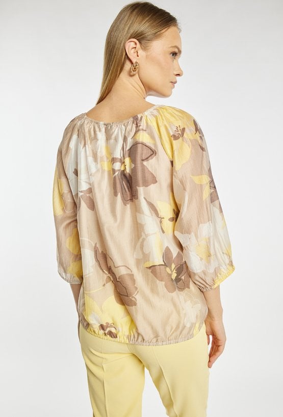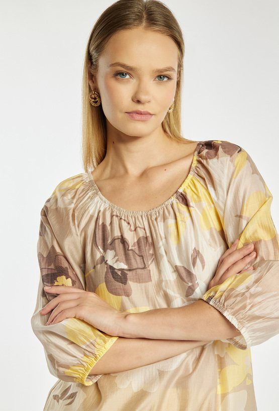 Bluzka damska o luźnym, komfortowym kroju z rękawem o długości 3/4. Model z marszczonym, okrągłym dekoltem oraz subtelnym wzorem kwiatowym, który nadaje całości lekkiego i kobiecego charakteru. Dół bluzki wykończony elastyczną gumką zapewnia dobre dopasowanie i wygodę noszenia. Doskonale sprawdzi się zarówno w codziennych stylizacjach, jak i w bardziej eleganckich zestawieniach.