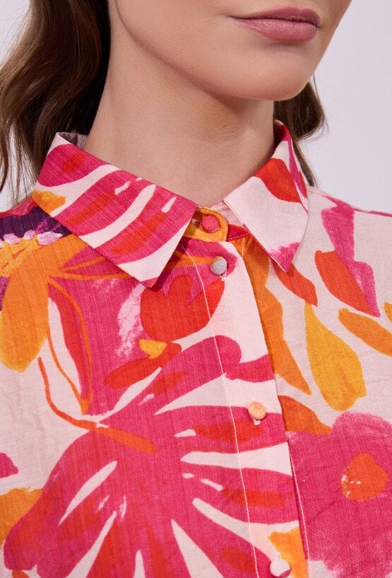 Koszula damska o luźnym, swobodnym kroju z rękawem o długości 3/4. Model zapinany na guziki, z klasycznym kołnierzykiem. Całość zdobi wyrazisty, kolorowy wzór z motywem kwiatowym, przyciągający uwagę i nadający stylizacji świeżości. Modelka na zdjęciu ma 177 cm wzrostu i prezentuje rozmiar S.