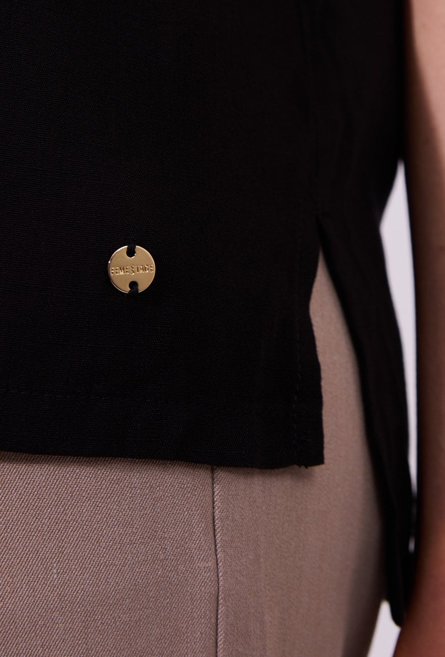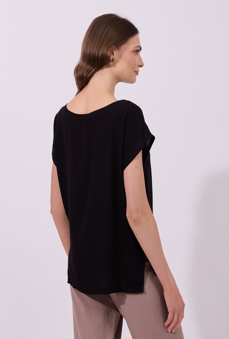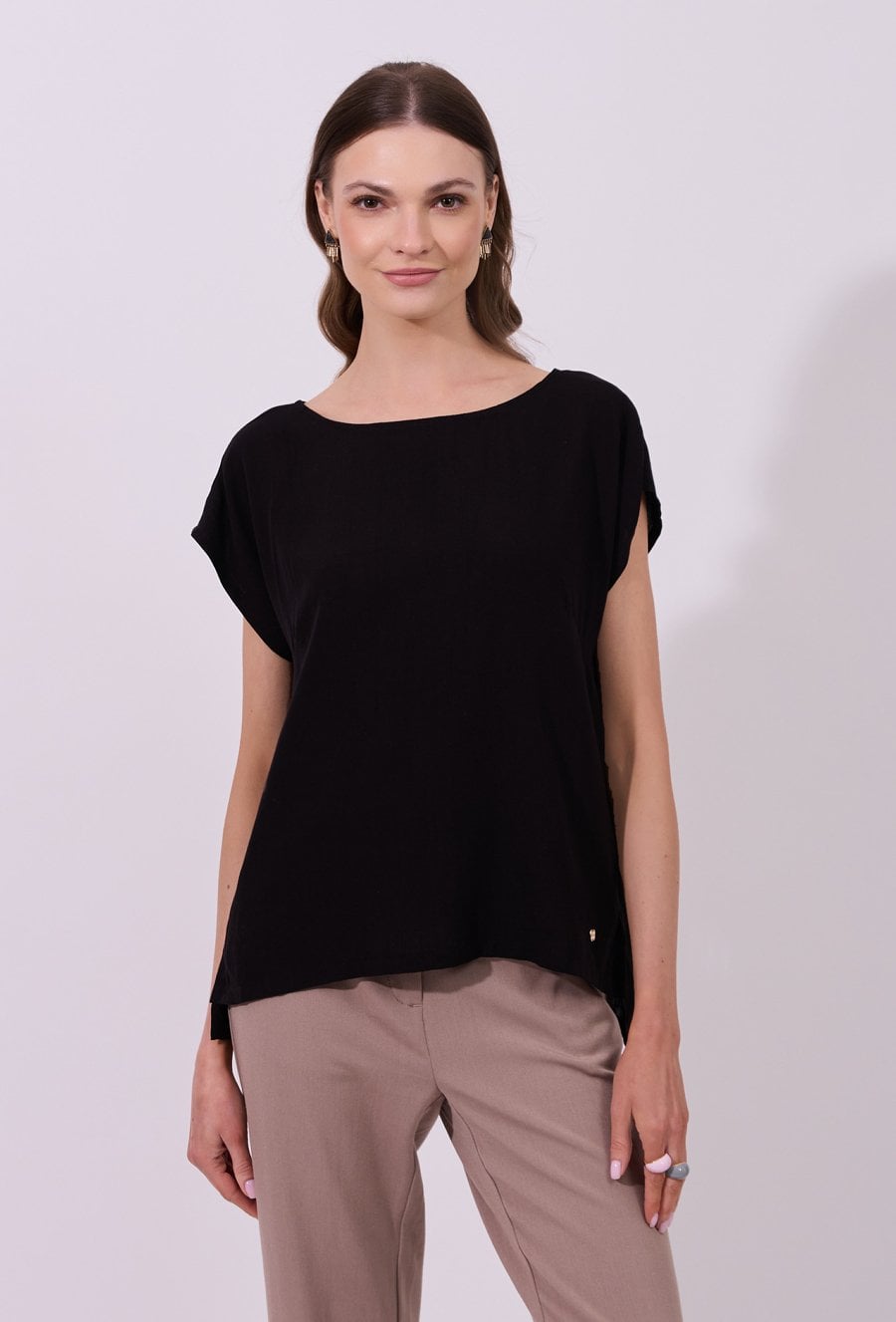 Bluzka damska o swobodnym kroju z krótkim rękawem. Model z klasycznym, okrągłym dekoltem, wykonany wiskozy. Całość zdobi wyrazisty wzór w kontrastowych kolorach, który nadaje stylizacji świeżości i oryginalnego charakteru. Luźny fason zapewnia komfort noszenia, a uniwersalny krój sprawia, że bluzka doskonale sprawdzi się w codziennych, letnich stylizacjach. Modelka na zdjęciu ma 177 cm wzrostu i prezentuje rozmiar S.