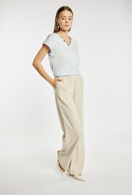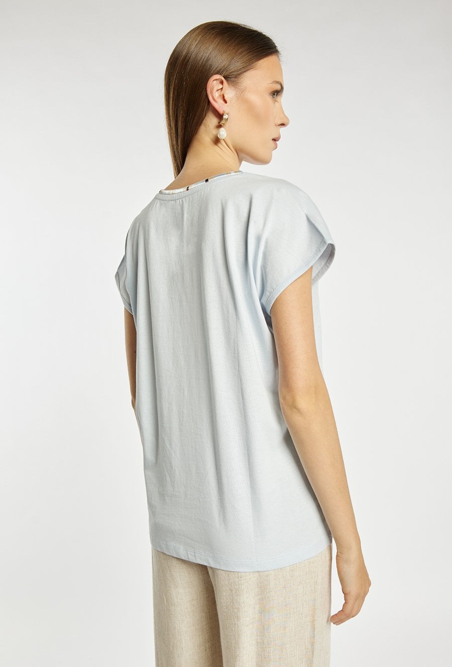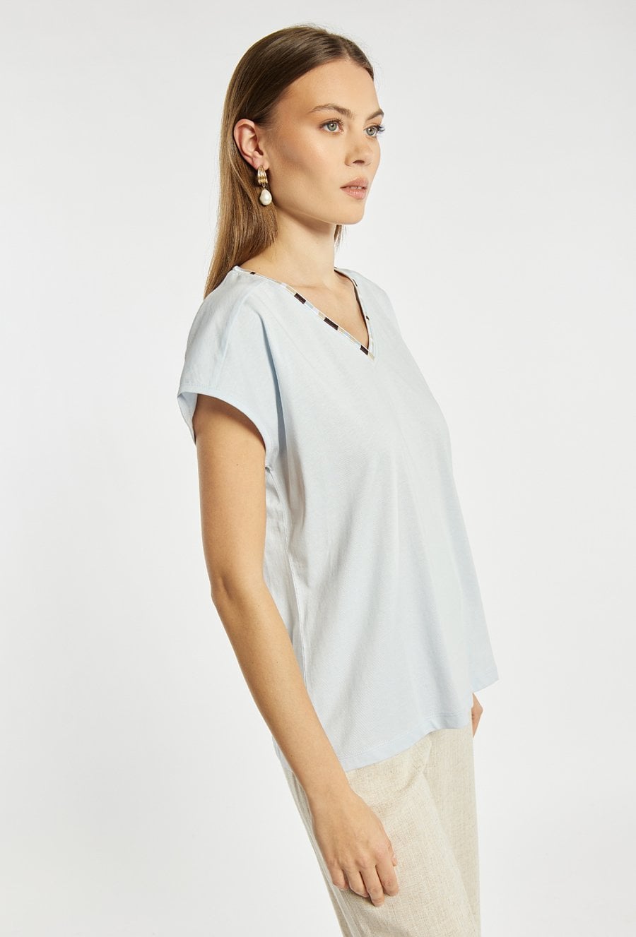 T-shirt damski o luźnym, wygodnym kroju z krótkim rękawem i dekoltem w kształcie litery V, wykończonym dekoracyjną lamówką. Minimalistyczny fason sprawia, że model jest uniwersalny i łatwy do stylizacji. Modelka na zdjęciu ma 177 cm wzrostu i prezentuje rozmiar S.