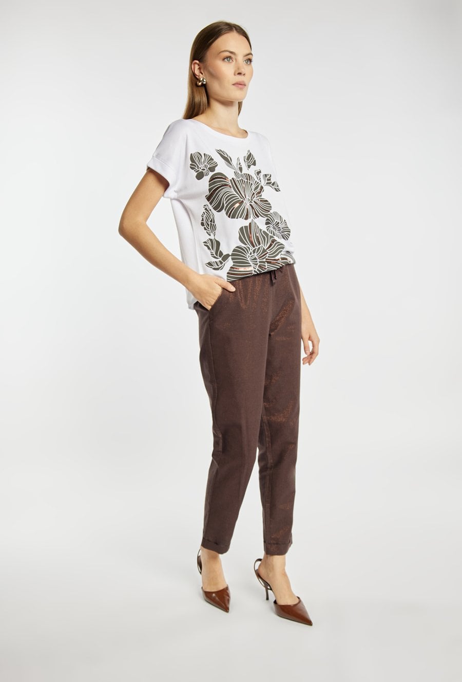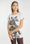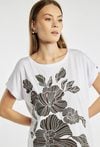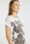 T-shirt damski o luźnym, wygodnym fasonie z krótkim rękawem i klasycznym, półokrągłym dekoltem. Duży, efektowny nadruk z motywem roślinnym przyciąga uwagę i nadaje całości nowoczesnego charakteru. Modelka na zdjęciu m 177 cm wzrostu i prezentuje rozmiar S.