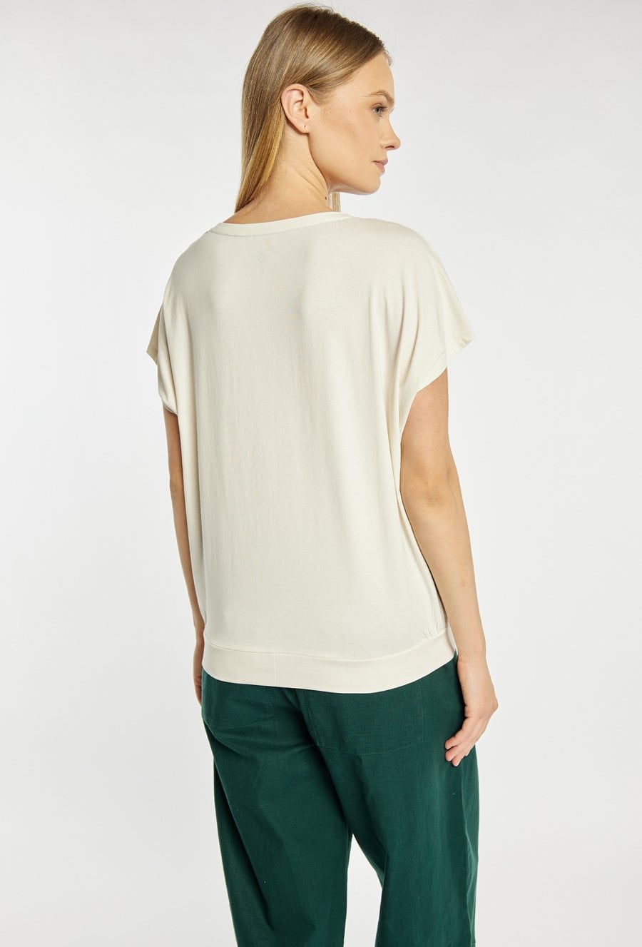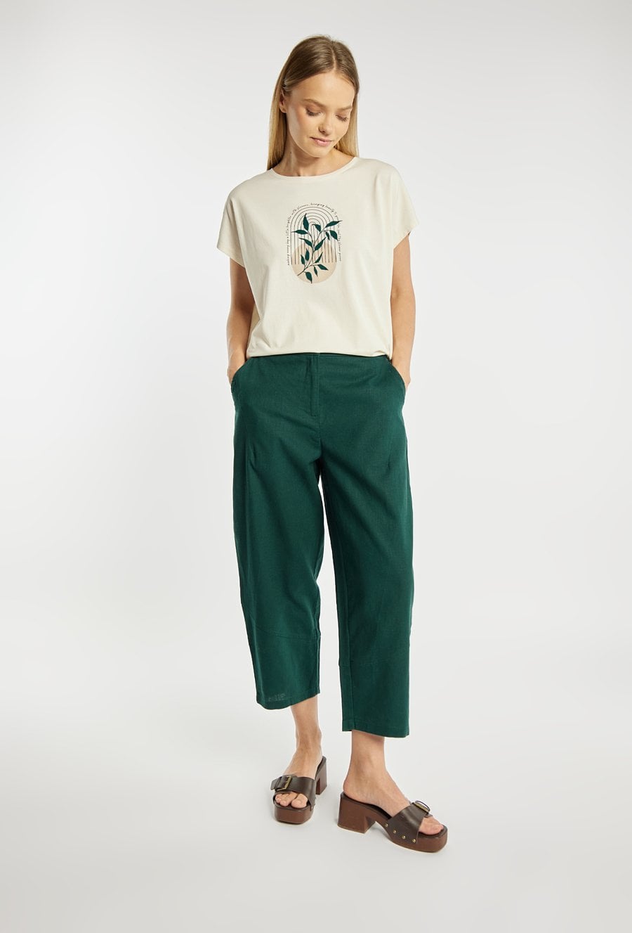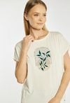 T-shirt damski o swobodnym kroju z krótkim rękawem i klasycznym, półokrągłym dekoltem. Z przodu znajduje się subtelny nadruk z motywem roślinnym i dekoracyjnymi elementami, stanowiący stylowy akcent. T-shirt idealna do codziennych stylizacji. Modelka na zdjęciu ma 177 cm wzrostu i prezentuje rozmiar S.